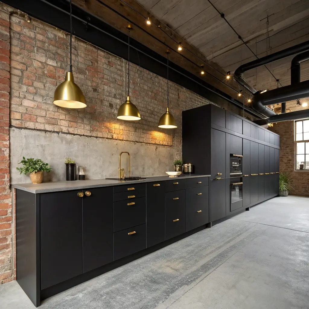 Ever wondered what happens when tough meets glamorous? You get an industrial black and gold kitchen that’s both edgy and elegant. This style combines raw materials with luxe finishes for a look that’s uniquely yours.