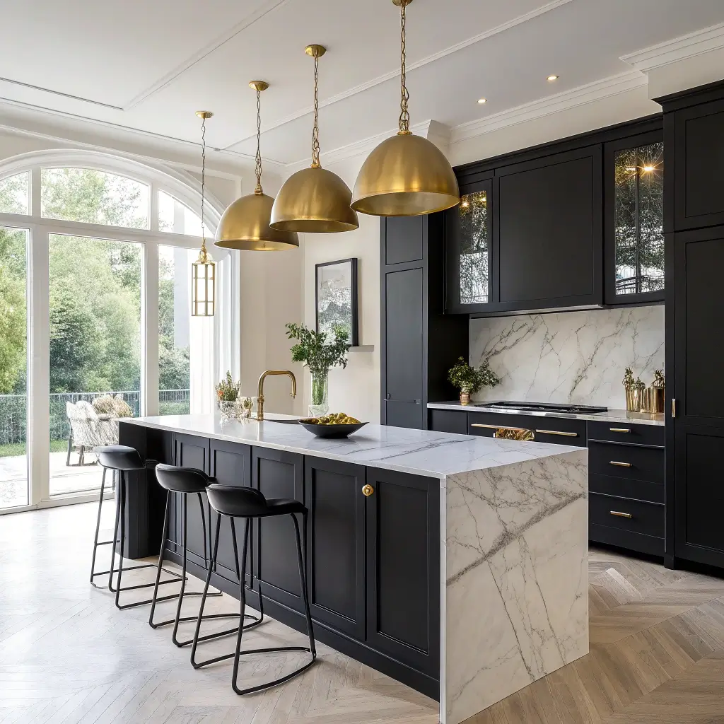 Now we’re talking serious luxury! Black marble with gold veining is basically nature showing off, and when you pair it with gold fixtures? Chef’s kiss. This combination makes your kitchen look like it belongs in a penthouse.