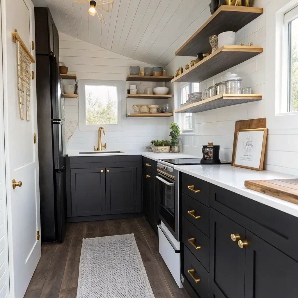 Vertical storage is your best friend here. Think tall black cabinets that draw the eye up, with gold handles creating vertical lines. Use that often-wasted space above cabinets for decorative gold pieces or plants in gold pots.