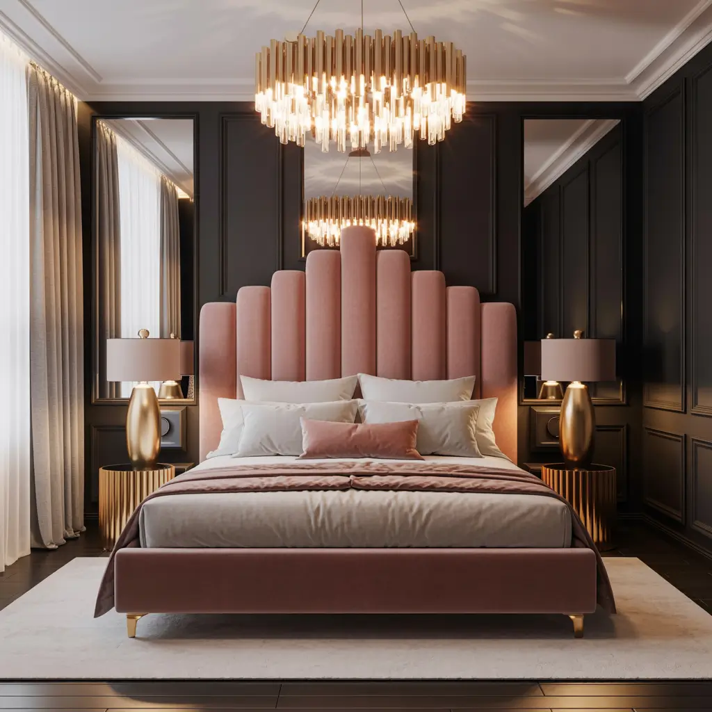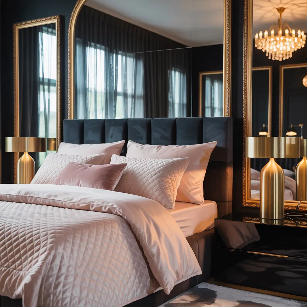 Picture a tufted black leather headboard, silk pink sheets, and gold hardware on everything. Maybe throw in a vintage gold mirror, some brass lighting fixtures, and pink flowers in a black and gold vase. This isn’t just a bedroom; it’s a sanctuary. IMO, this style works best when you commit fully – no half measures here 🙂