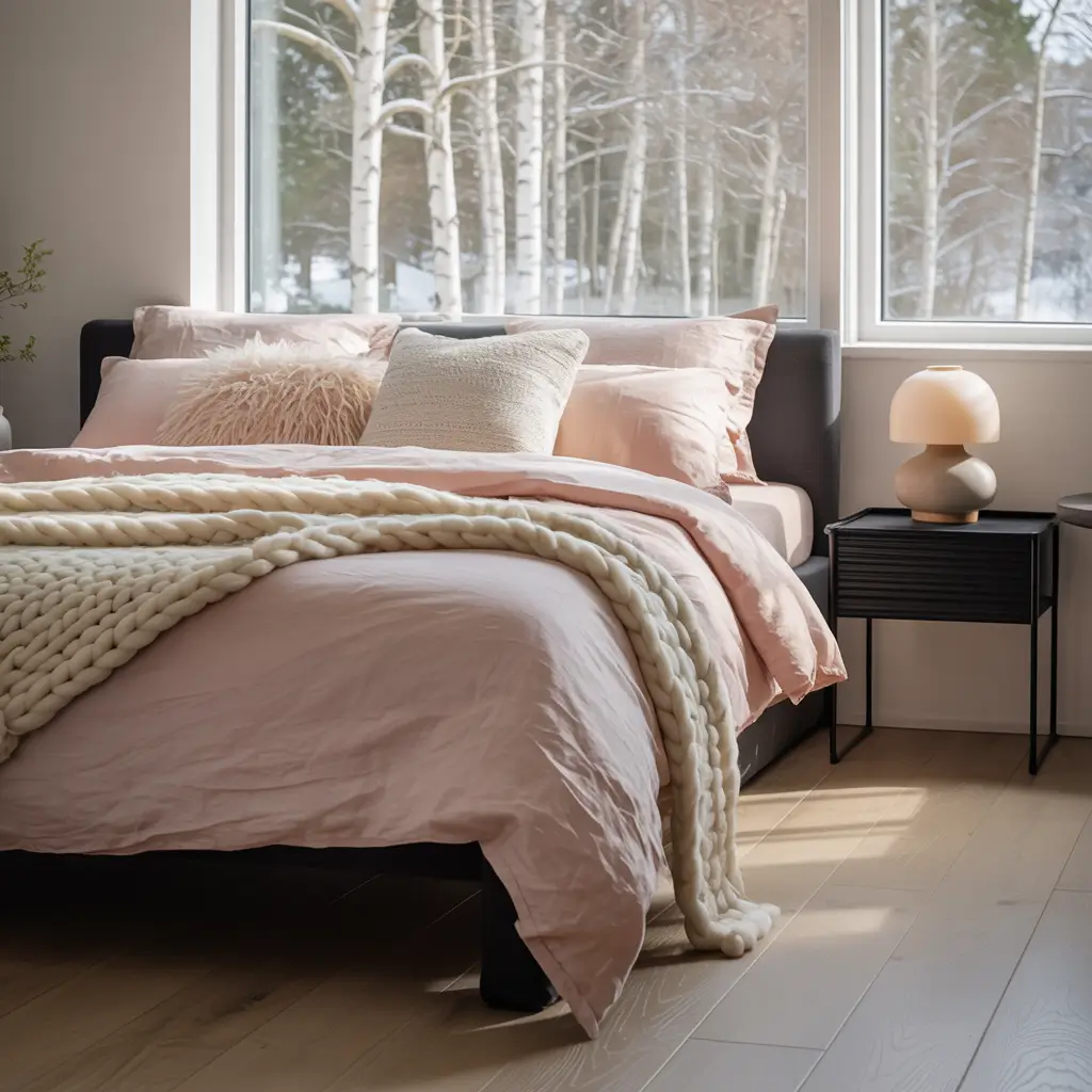 Think light wood floors, black metal fixtures, and the softest pink throws you’ve ever touched. Add some black and white geometric patterns, a few pink candles, and maybe a chunky knit blanket in blush. The result? A bedroom that makes you want to curl up with a good book and never leave.