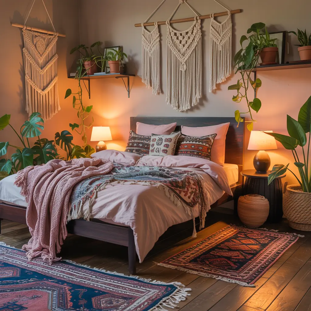 Boho style gets a sophisticated upgrade when you limit the color palette to black and pink. Instead of the typical rainbow of colors, you get this refined bohemian vibe that feels both free-spirited and pulled together. Think macramé wall hangings in black cord, pink pampas grass, and layers upon layers of textiles.
