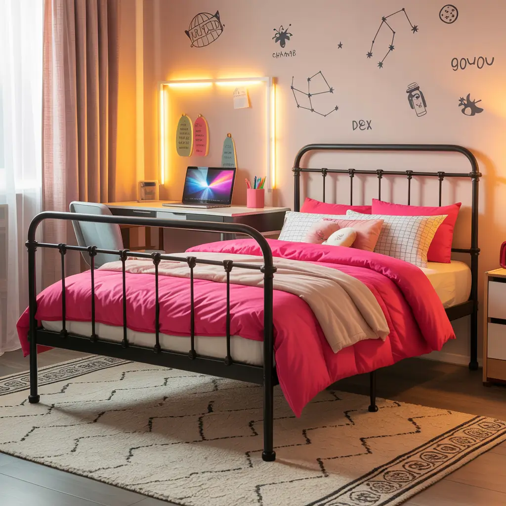 Focus on sophisticated patterns, quality furniture that’ll last through college, and decor that reflects their actual interests. Maybe they’re into music? Black acoustic panels with pink LED backlighting. Art lover? Gallery wall with black frames and pink accents. The possibilities are endless when you listen to what they actually want.