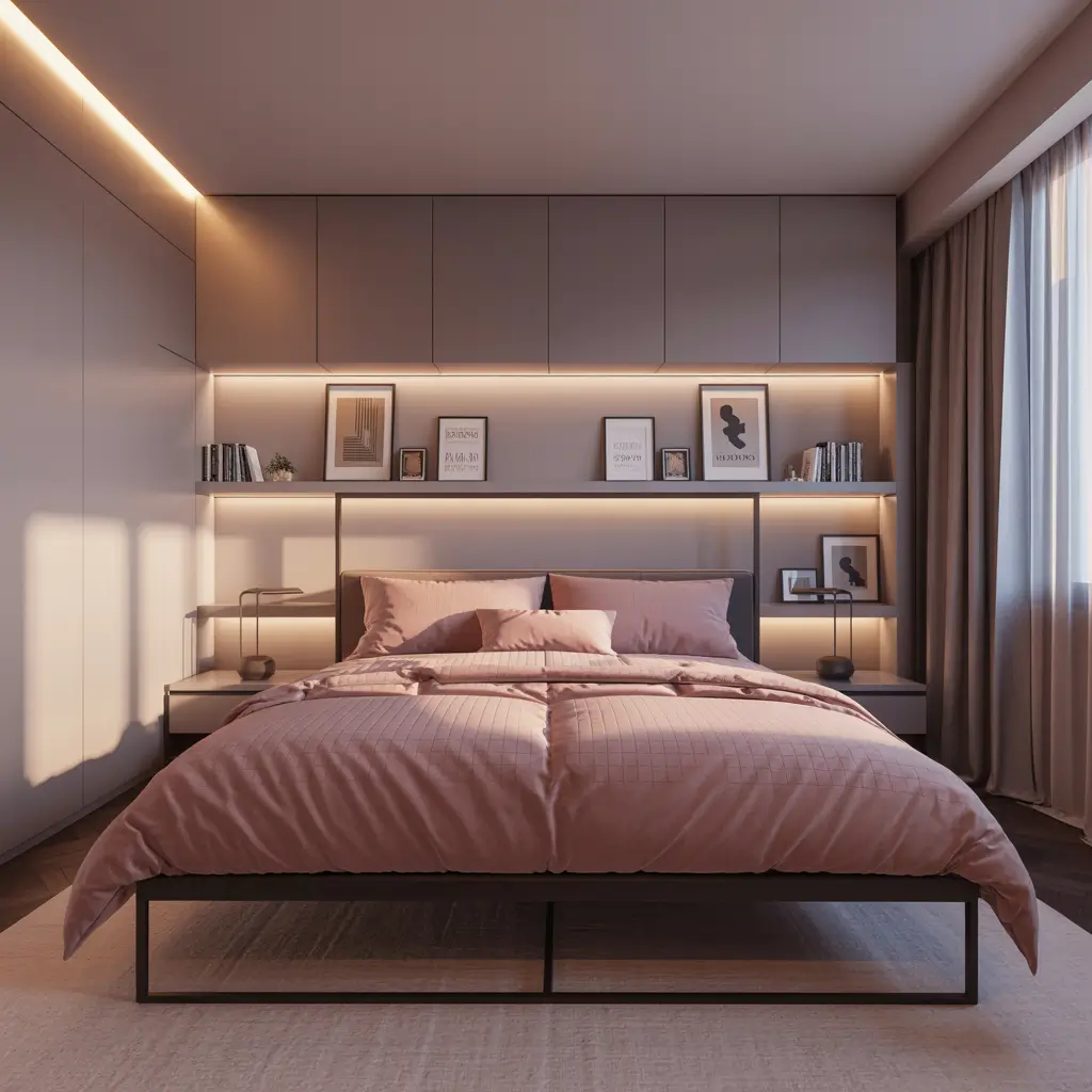 Install LED strips behind your headboard for a floating effect, or use pink LEDs to backlight black floating shelves. The contemporary style loves clean lines and innovative materials, so think acrylic furniture with pink cushions, black metal and glass combinations, and definitely some smart home integration. Why get up to turn off the lights when Alexa can do it for you?