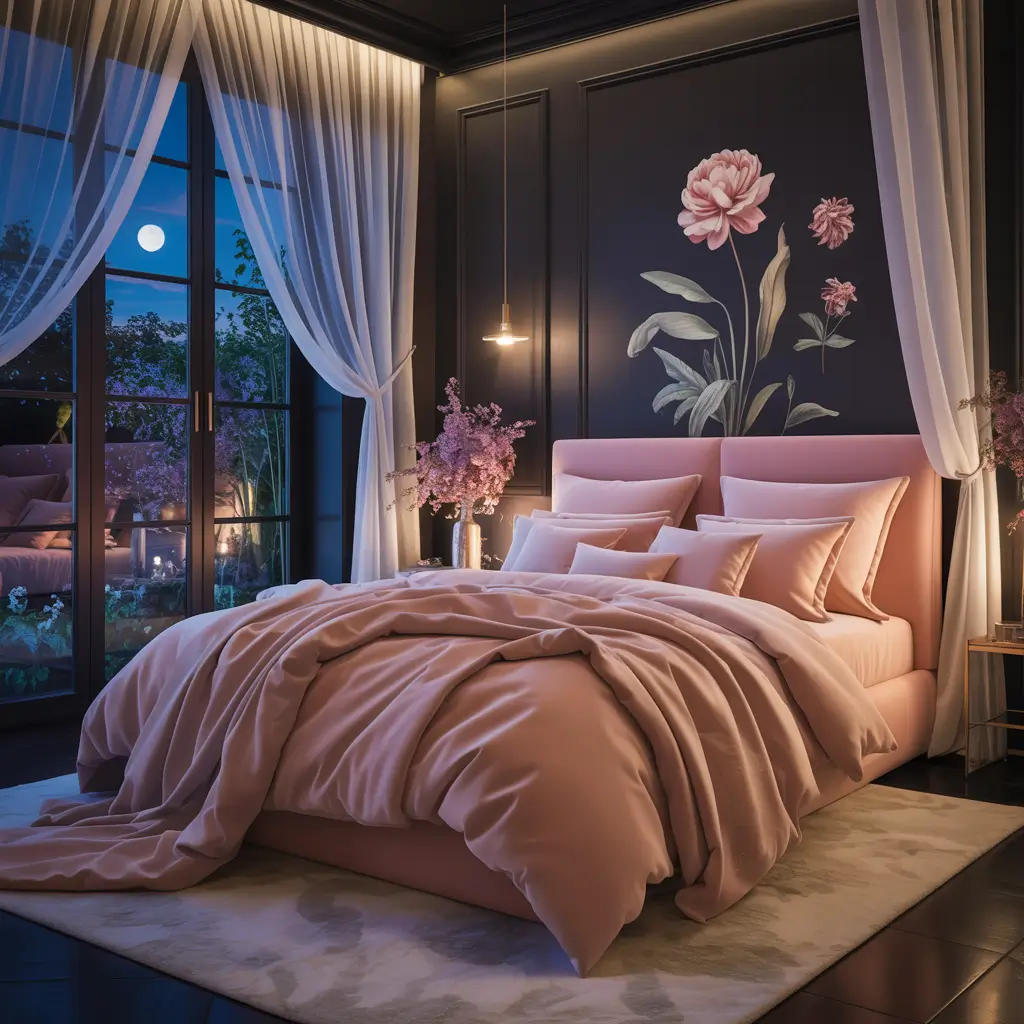 Layer different floral patterns – maybe a large-scale floral wallpaper in black and pink, paired with solid pink bedding and black furniture. Add fresh pink peonies or roses in black vases, and consider a vintage-inspired chandelier with pink crystals. The key is balancing the feminine florals with the strong black elements.