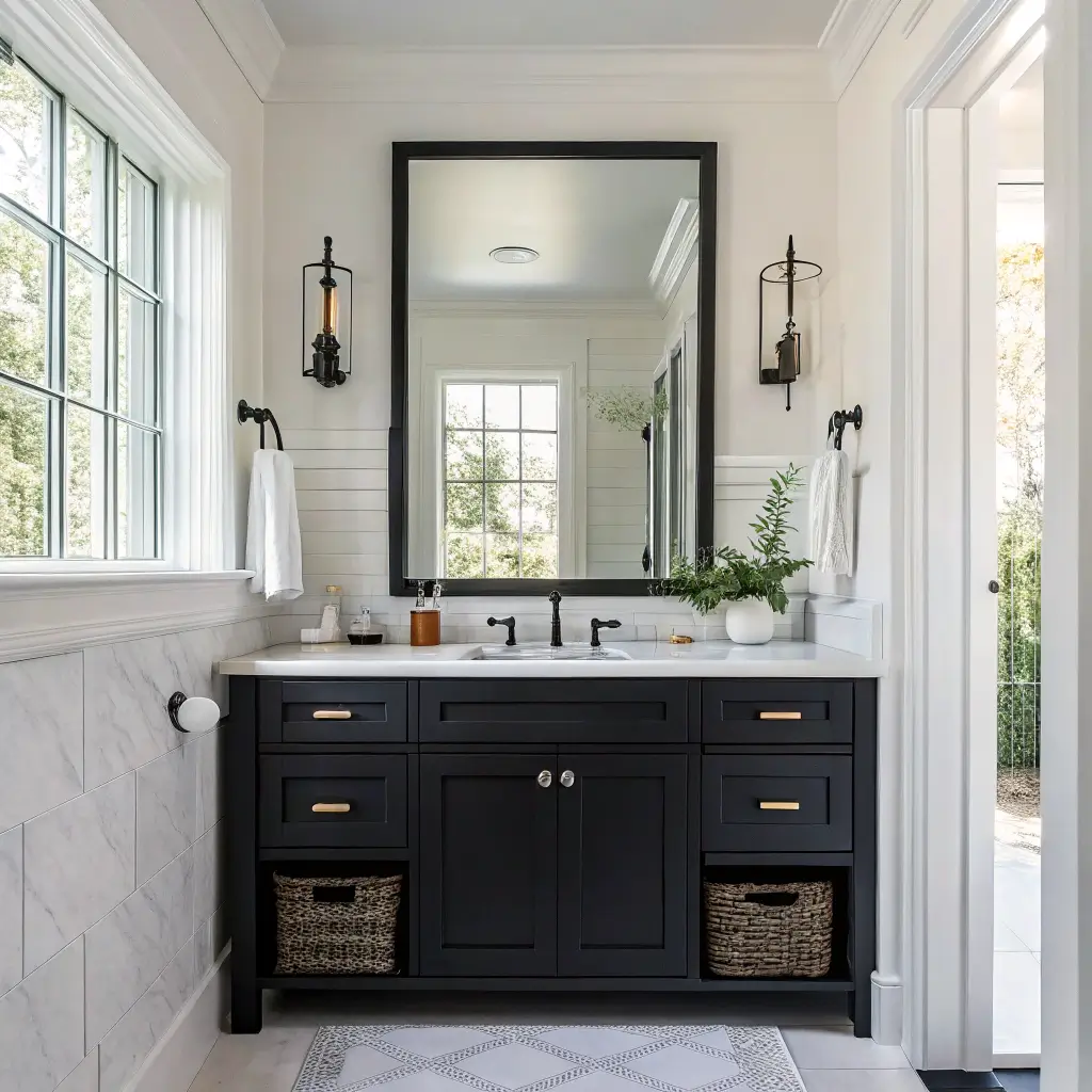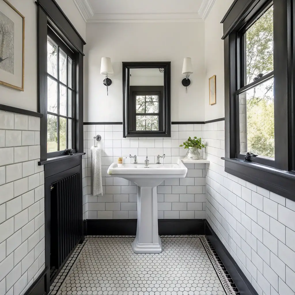 This approach works especially well in older homes. The black trim highlights architectural details like crown molding or window frames. When I renovated my 1940s bungalow bathroom, black trim turned boring white walls into something special.