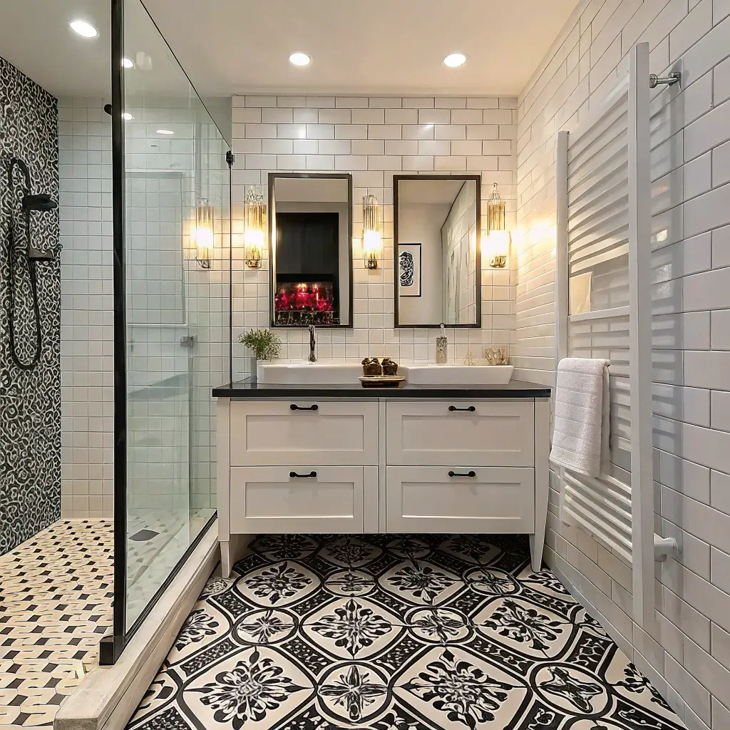 Why settle for boring when you can create actual art with tiles? High-contrast patterns turn your bathroom into a gallery. I’ve seen bathrooms where the tile work literally stops people in their tracks.