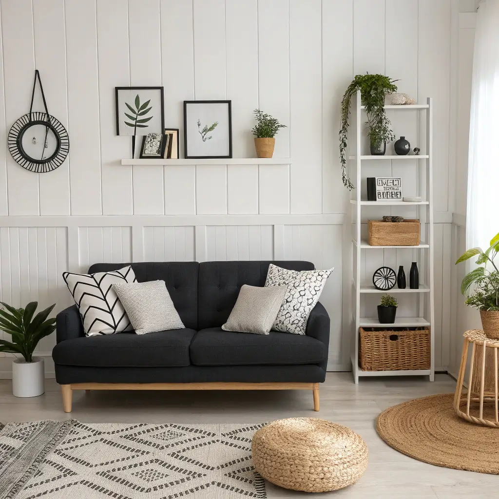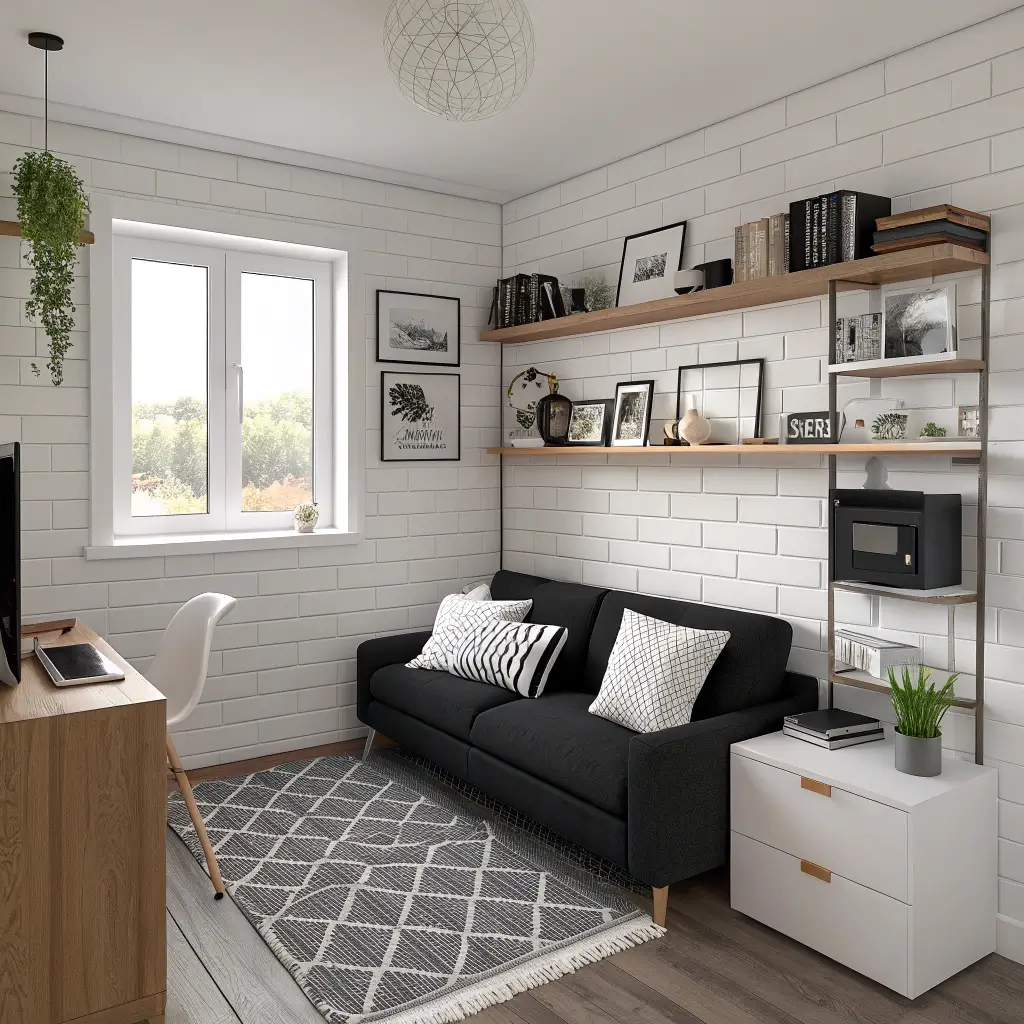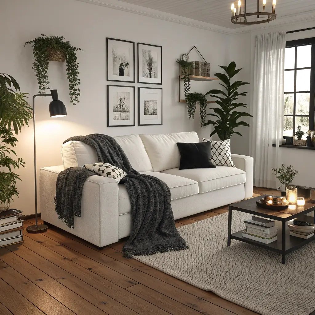 Keep walls predominantly white to maximize light reflection. Use black as an accent through furniture legs, picture frames, and smaller decor pieces. Mirrors become your best friend – especially ones with black frames that tie into your color scheme while bouncing light around.