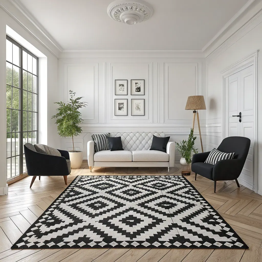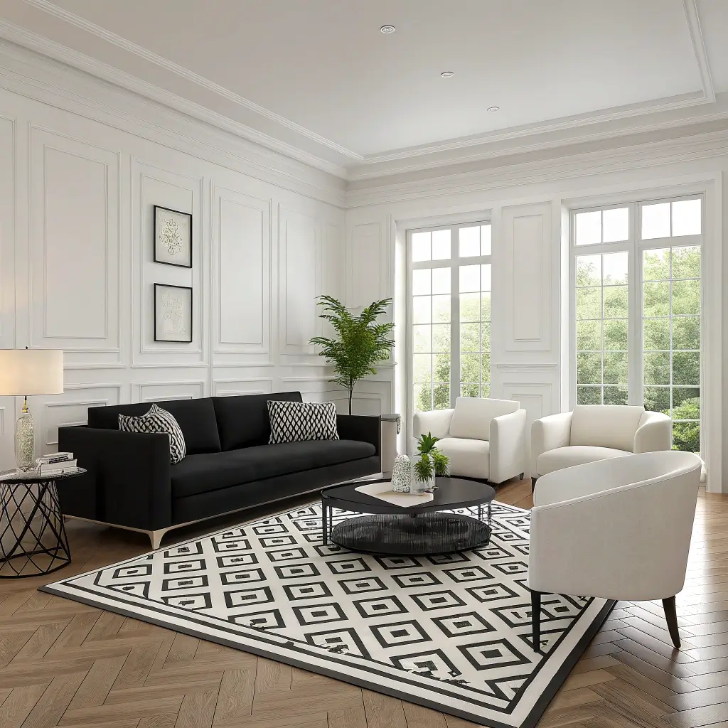 Here’s where things get fun – patterned rugs can completely transform your black and white space from basic to brilliant. Whether you’re into geometric prints, traditional patterns, or abstract designs, the right rug anchors your entire room.