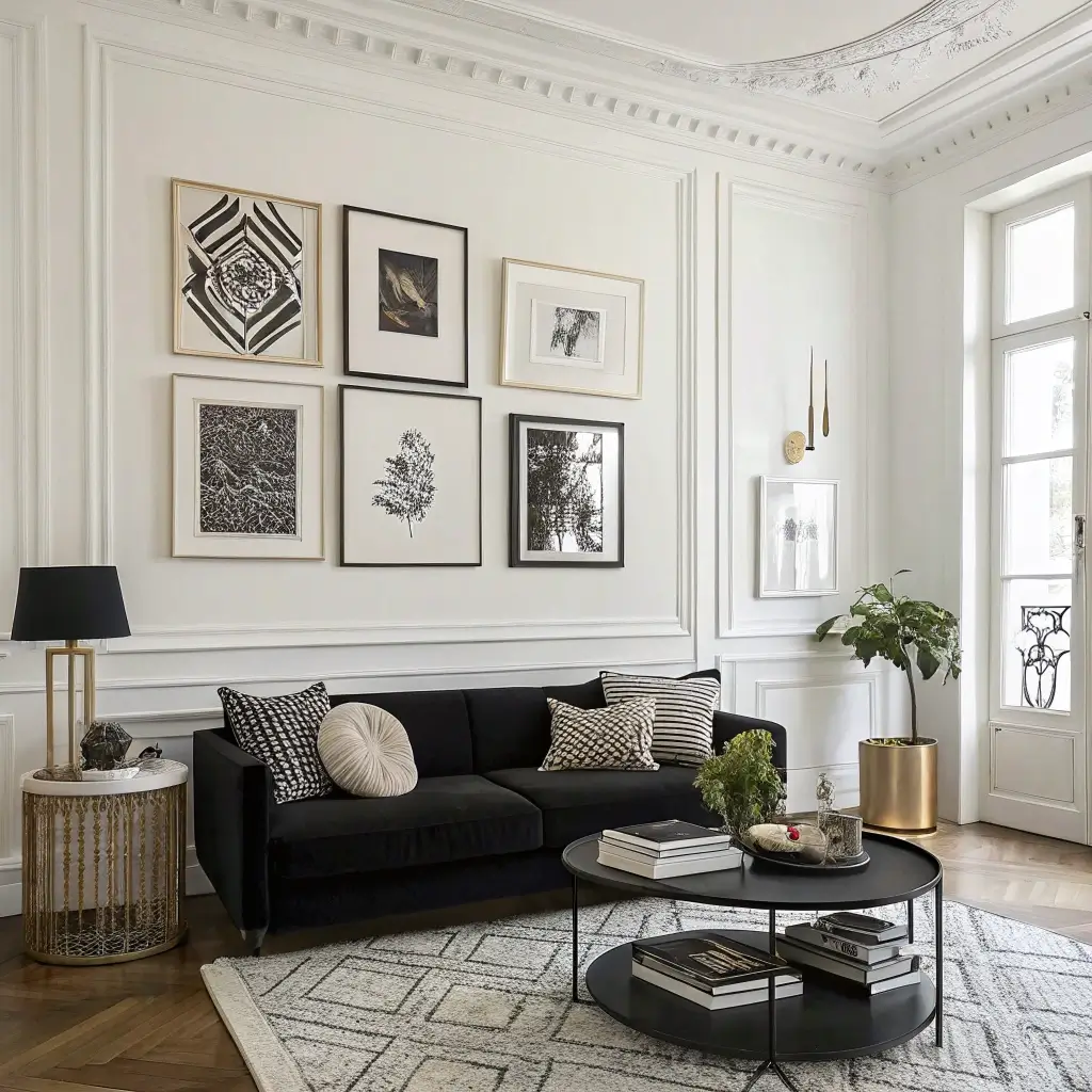 Consider a black accent wall behind your sofa – instant focal point without any effort. Or go bold with black and white striped wallpaper on one wall. Too permanent? Removable wallpaper exists, and it’s basically the best invention since sliced bread. Gallery walls featuring black and white photography create personality without color chaos.