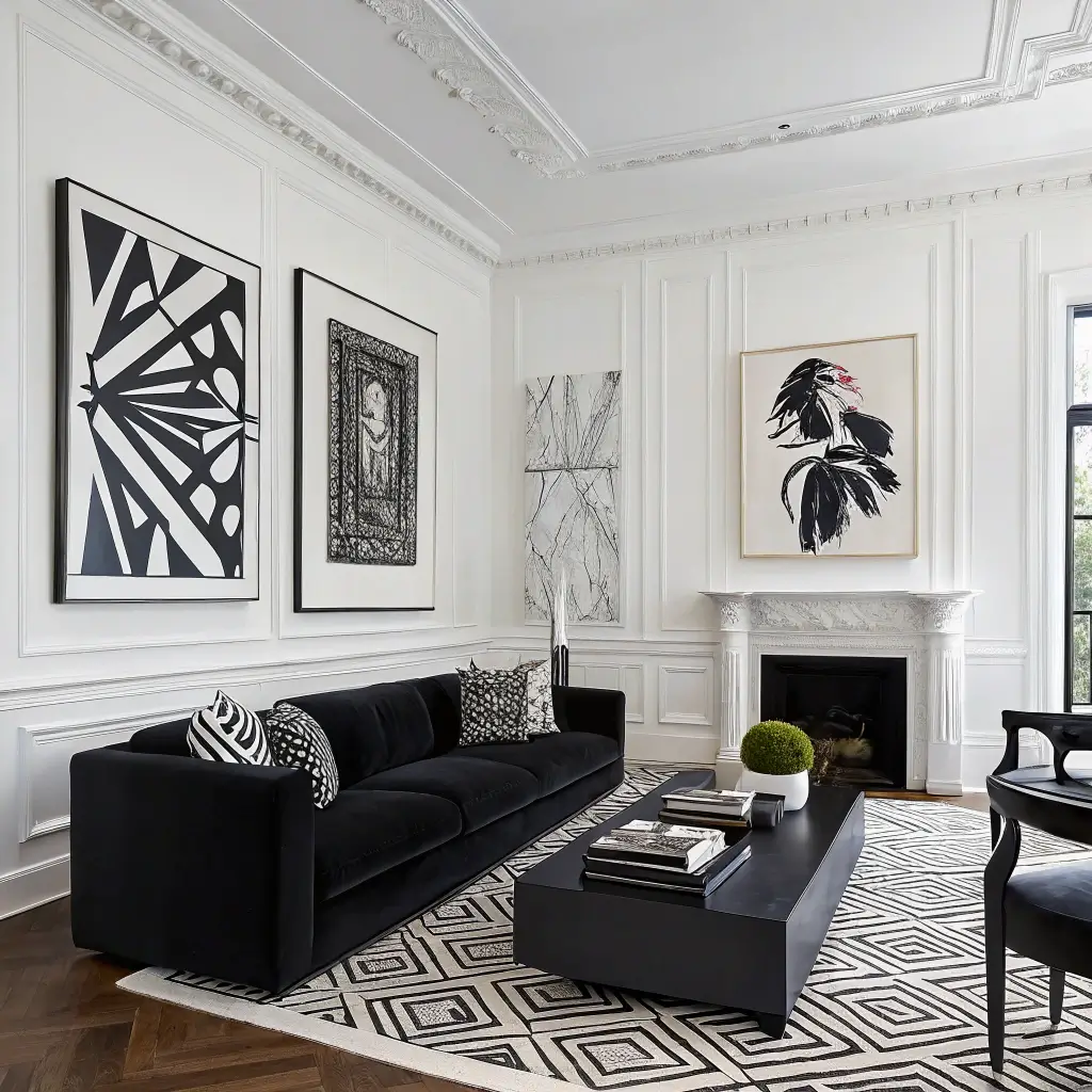 Nothing transforms a monochrome room quite like bold artwork. Whether you’re into abstract pieces, photography, or graphic prints, art adds that personal touch that makes a house feel like home.