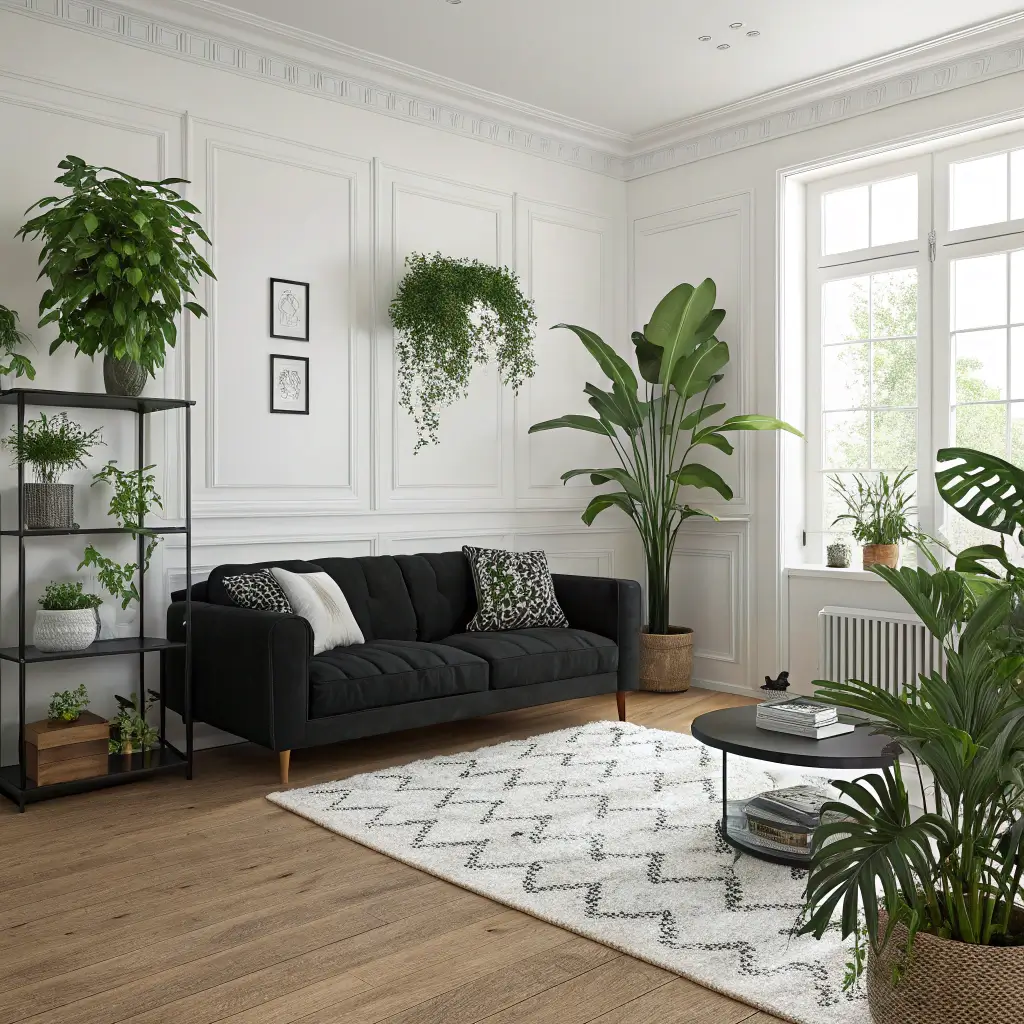 Snake plants, fiddle leaf figs, and monsteras all look stunning against white walls. Place them in black or white planters to maintain your color scheme while adding organic shapes. The contrast between structured furniture and flowing plant forms? Pure design gold.