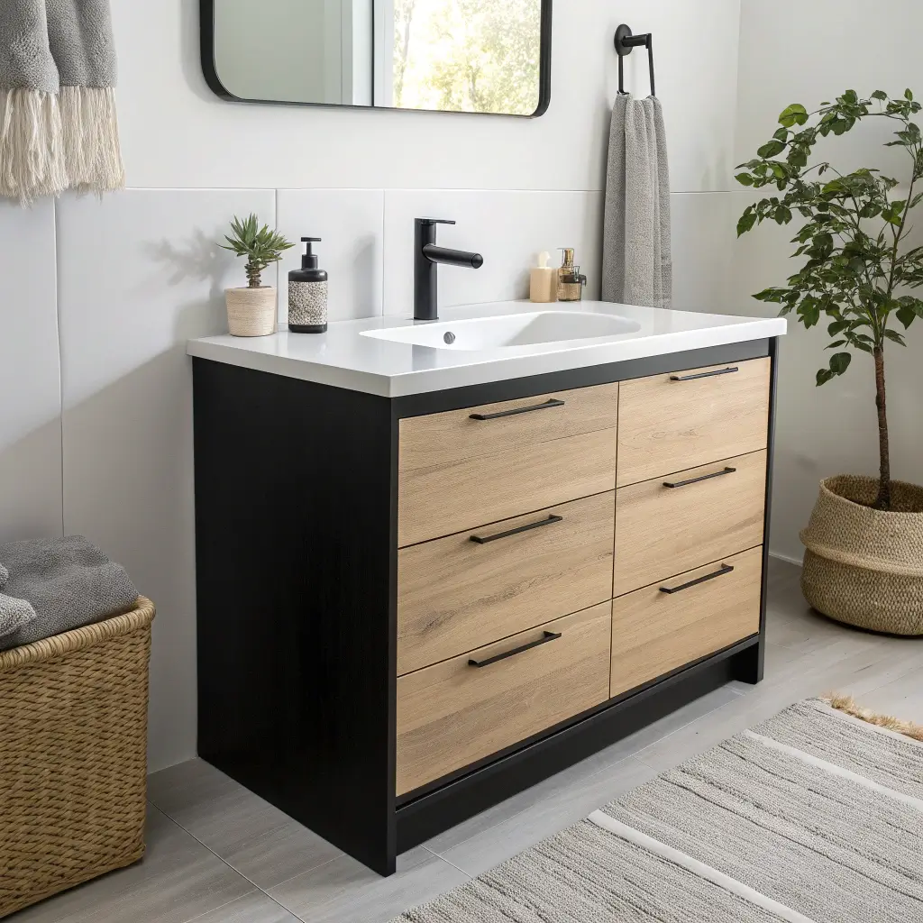 Minimalism isn’t about having nothing—it’s about having exactly what you need and making it look damn good. A minimalist black and wood vanity becomes the star of your bathroom when you strip away all the unnecessary clutter.
