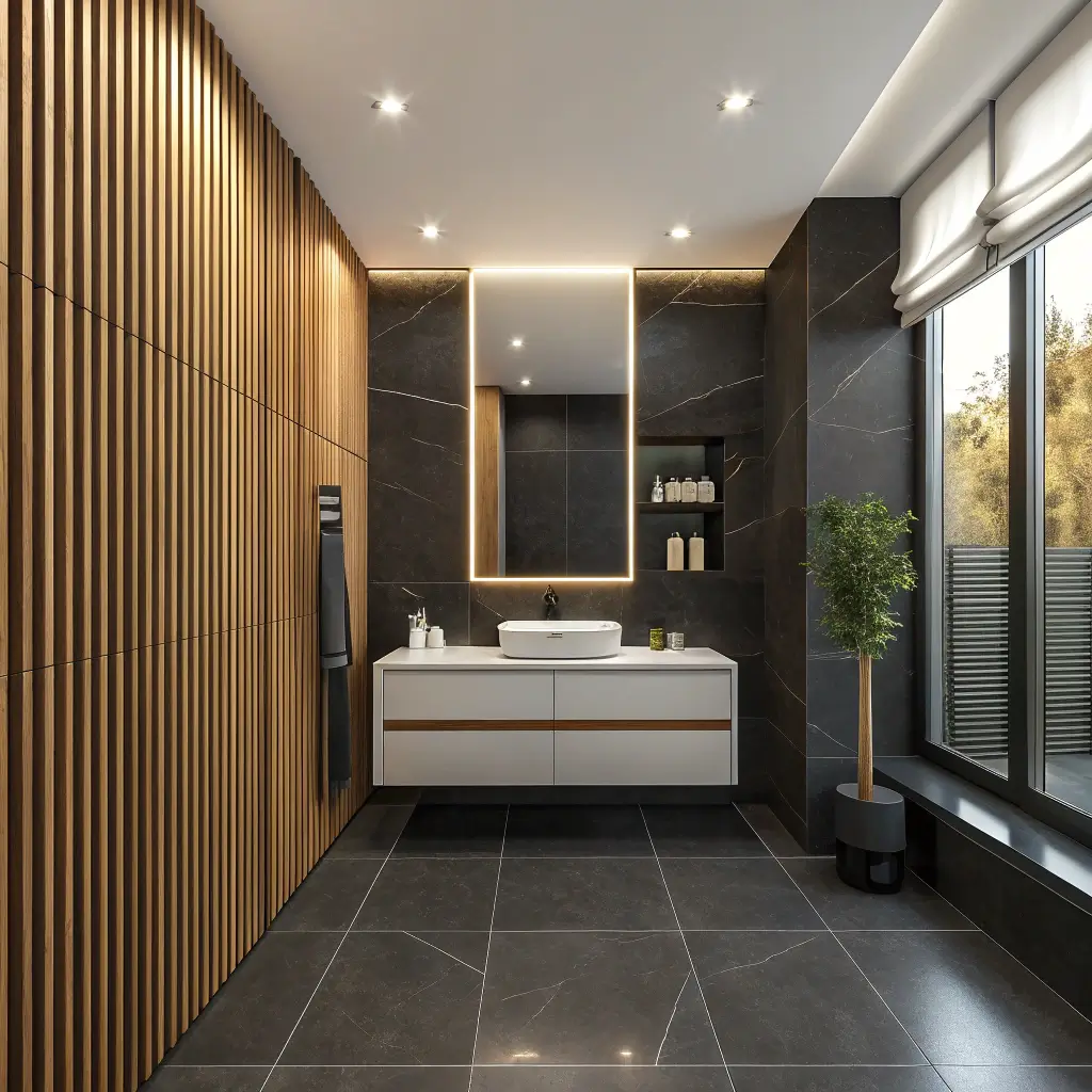 Or go bold with a black hexagonal tile wall adjacent to a wood-clad vanity area. The key is creating defined zones within your bathroom using these contrasting materials.