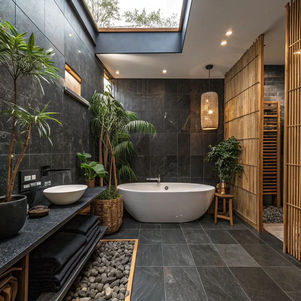 I visited a spa resort once where they’d created these incredible bathrooms with bamboo vanities, bamboo shower mats, and bamboo privacy screens, all accented with matte black fixtures and black river rock.