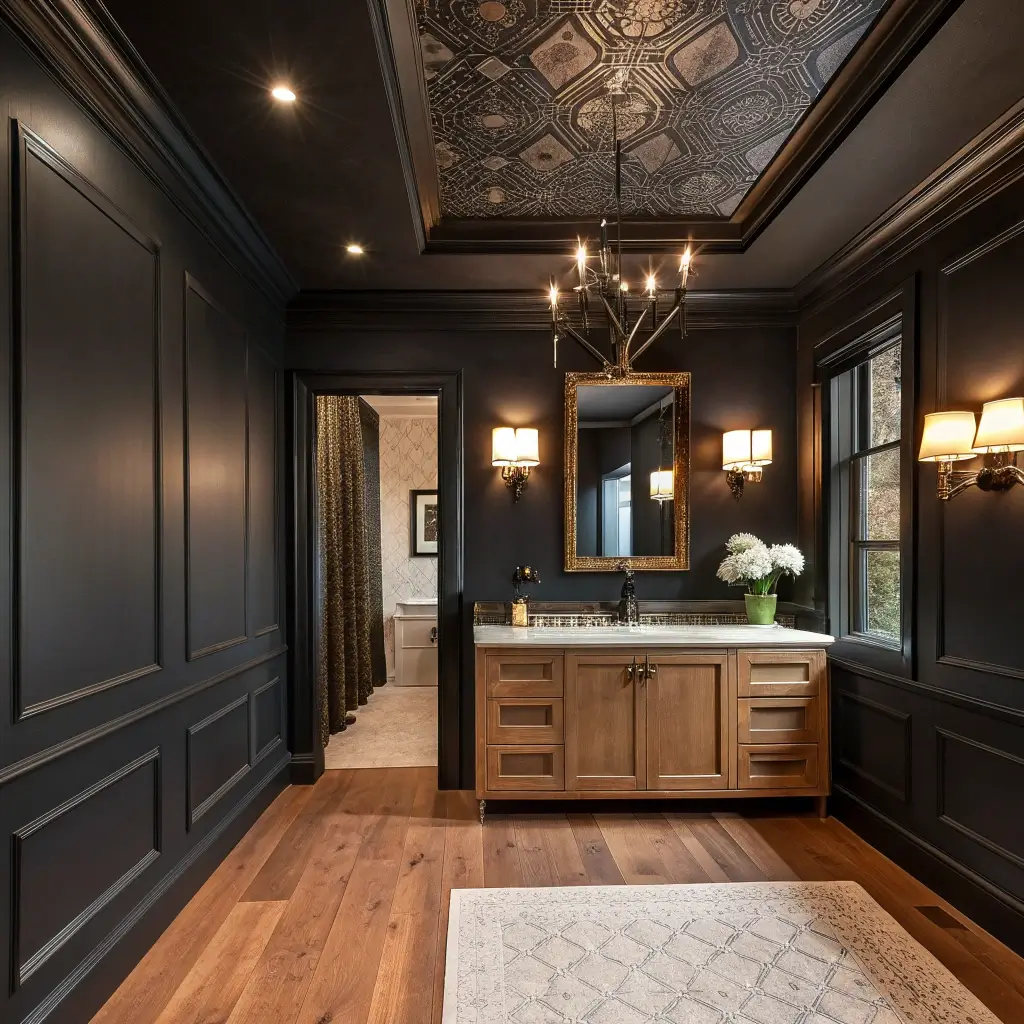 When you pair this bold move with warm wood flooring, you anchor the space with natural warmth that prevents it from feeling too dark or cave-like. I tried this in my powder room, and guests either love it or think I’m insane—but nobody forgets it.