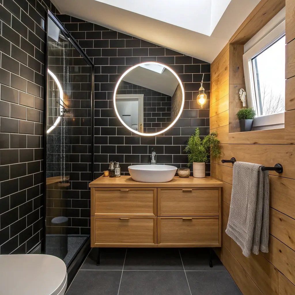 The Scandi approach to black and wood bathrooms focuses on light oak or birch paired with strategic black accents.