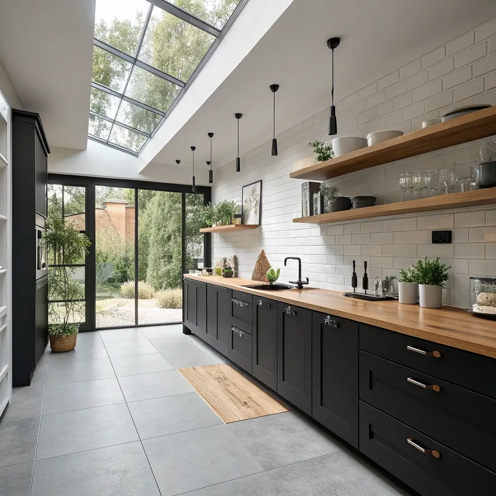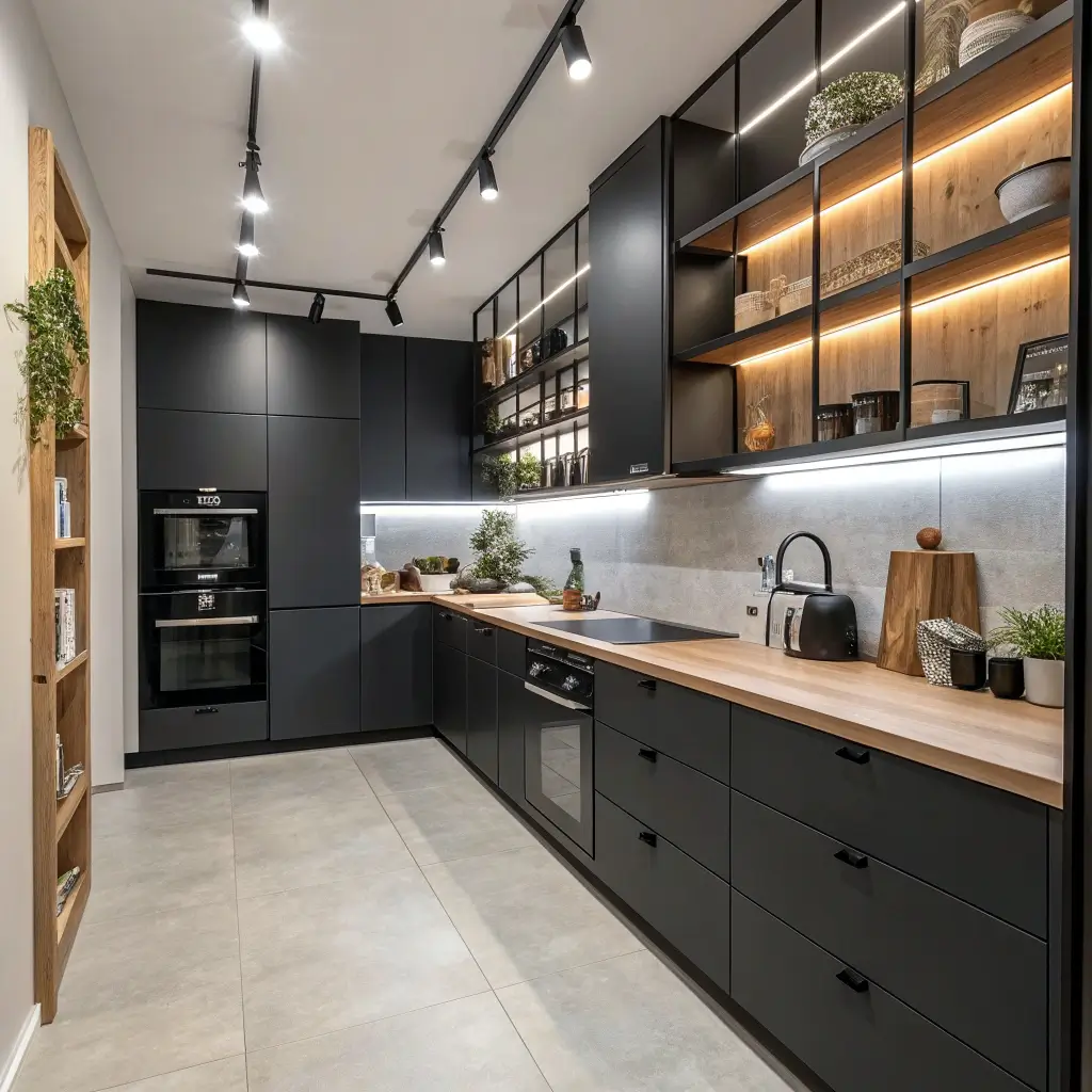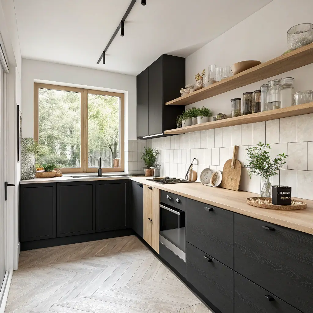 Open shelving isn’t going anywhere, and when you combine black cabinets with wooden floating shelves, you get storage that doubles as art. The contrast draws your eye upward, making ceilings feel higher and spaces feel larger.