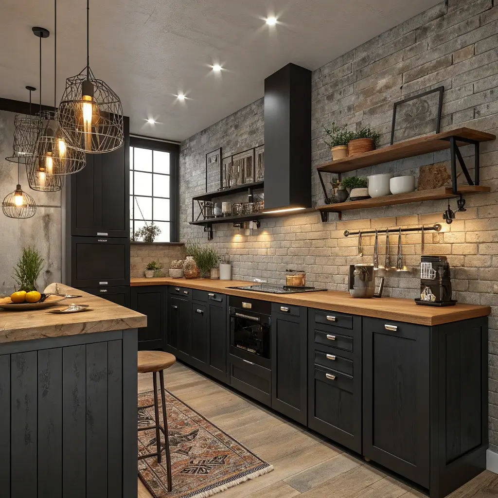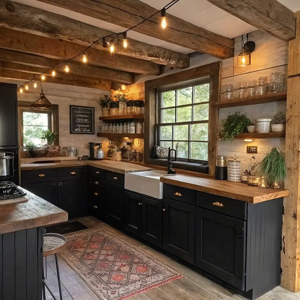 Picture black shaker cabinets with a massive reclaimed wood island, complete with those X-shaped supports that scream “farmhouse” without being too on-the-nose. Add some wrought iron hardware, maybe a wood beam ceiling if you’re feeling ambitious, and you’ve got a space that feels like it has stories to tell.