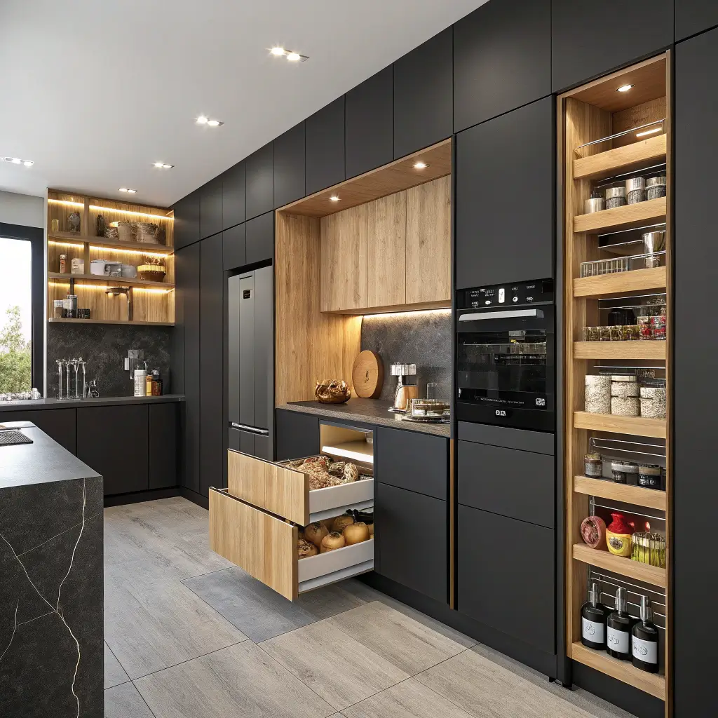 Let’s get practical for a minute. Storage in a black and wood kitchen can be both functional and gorgeous. Think black pantry cabinets with pull-out wooden drawers, or a black kitchen cart with a wooden top that provides extra prep space and storage.
