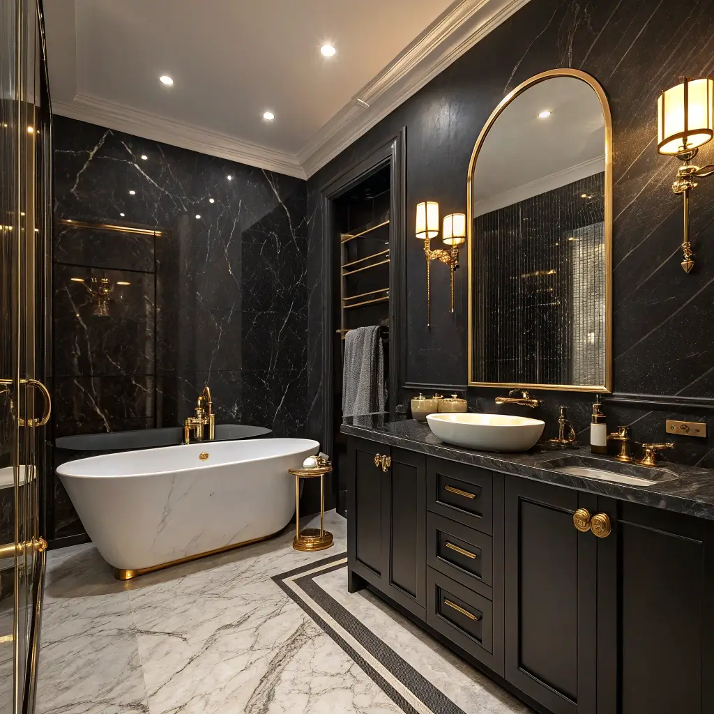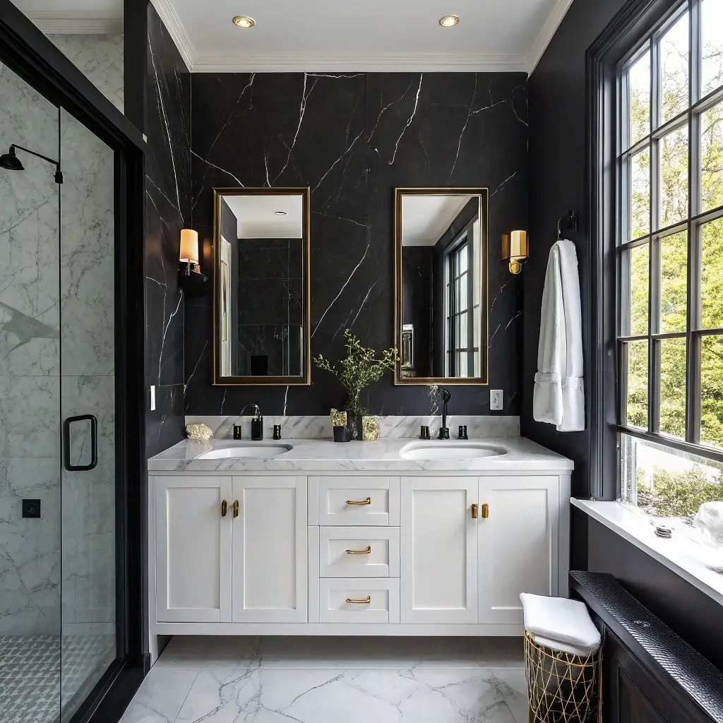 Can’t commit to a fully black bathroom? A single black accent wall paired with marble countertops gives you drama without overwhelm. This approach lets you test the waters while still making a significant impact.