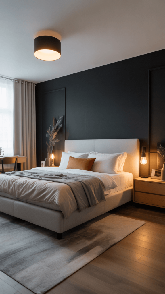 Choose the wall behind your headboard for maximum impact. This creates a natural focal point that anchors your entire room design. The contrast between your black wall and lighter surroundings actually makes your room feel larger – who would’ve thought, right?