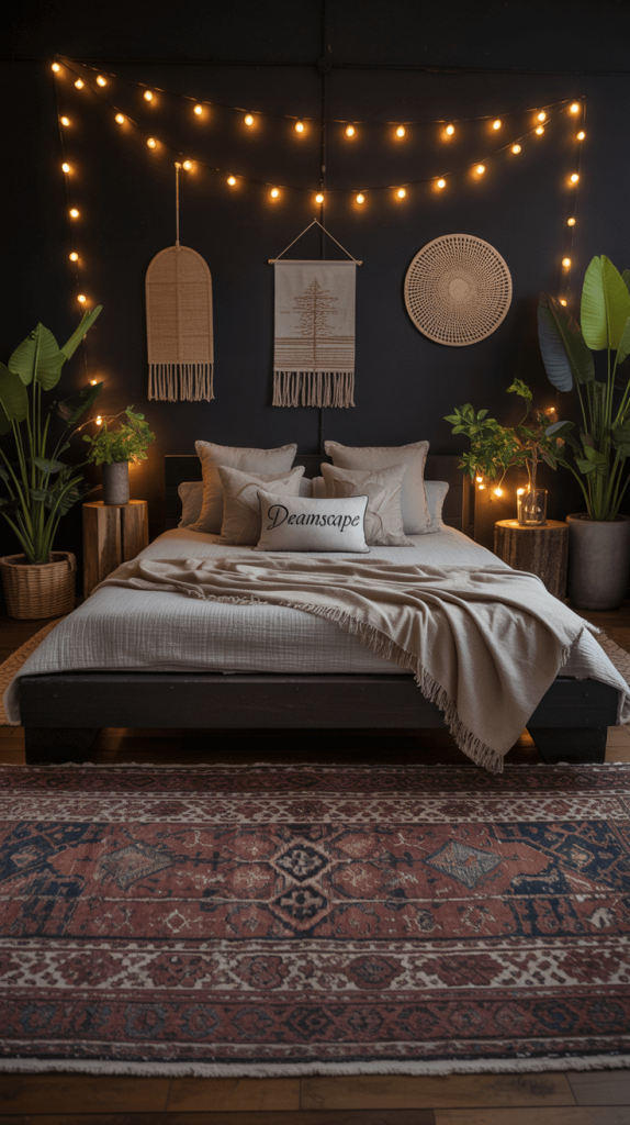 Who says boho can’t be moody? Black boho bedrooms combine free-spirited style with sophisticated darkness, creating spaces that feel both worldly and intimate. This style lets you break all those “black bedroom rules” everyone keeps mentioning.