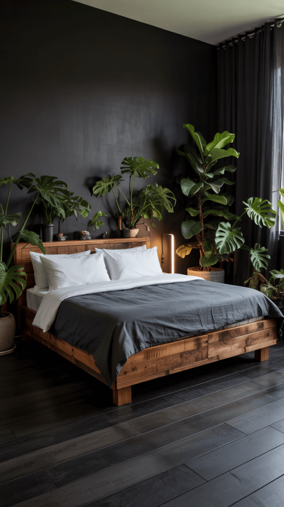 Large statement plants work best in black bedrooms. A fiddle leaf fig in the corner, a monstera on a plant stand, or hanging pothos from the ceiling – go big or go home. The dramatic scale matches the boldness of black walls.