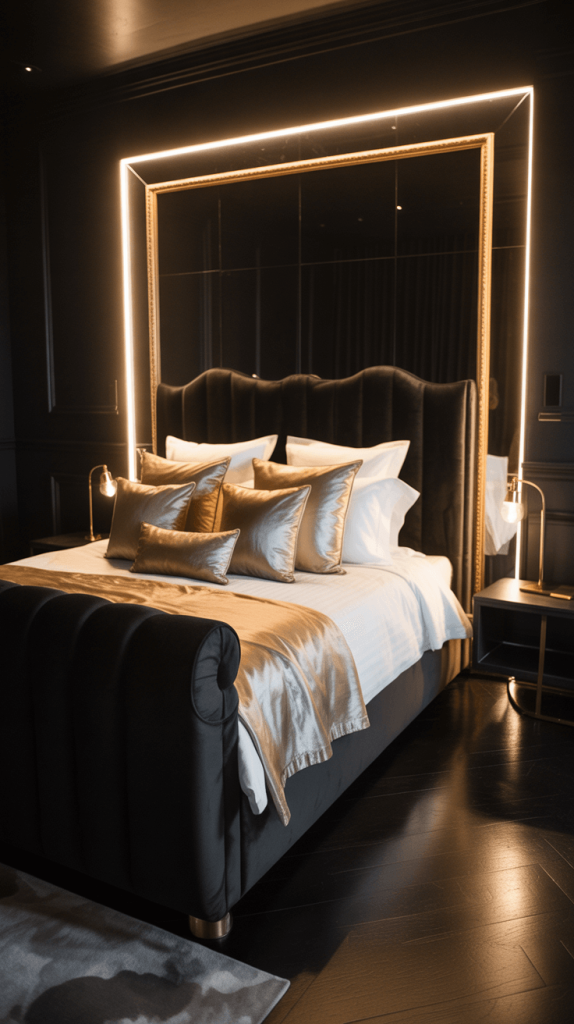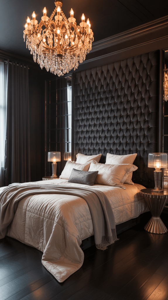 Mirrored furniture against black walls practically glows. Think mirrored nightstands, dresser tops, or even a mirrored vanity. The reflection of black in the mirror creates depth and mystery that solid furniture can’t achieve.