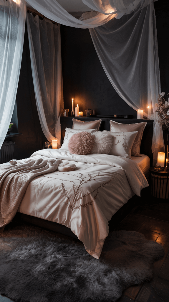 Soft lighting becomes essential for romantic black bedrooms. Install dimmer switches on all lights. Add candles (real or LED) throughout the space. String lights or fairy lights behind sheer curtains create ethereal glows.