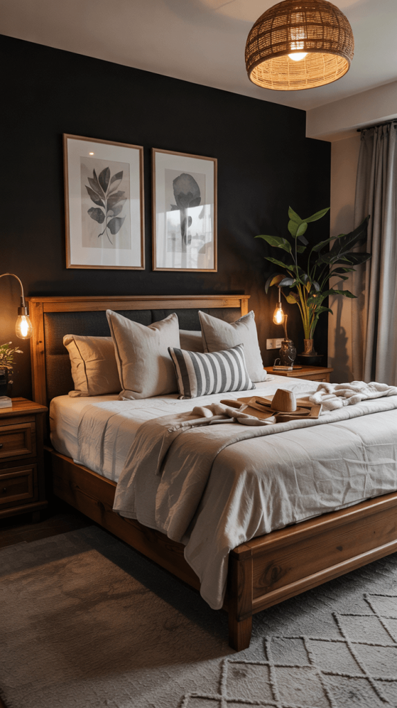 Wood warms up black like nothing else can. The natural grain and warm tones of wood furniture prevent black bedrooms from feeling cold or uninviting. This combination works whether you prefer light Scandinavian pine or rich walnut tones.