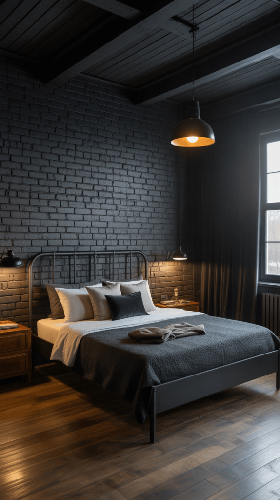 Industrial black bedrooms make you feel like you’re living in a converted loft, even if you’re in suburban split-level. The raw, unfinished aesthetic paired with black elements creates an edgy yet livable space.