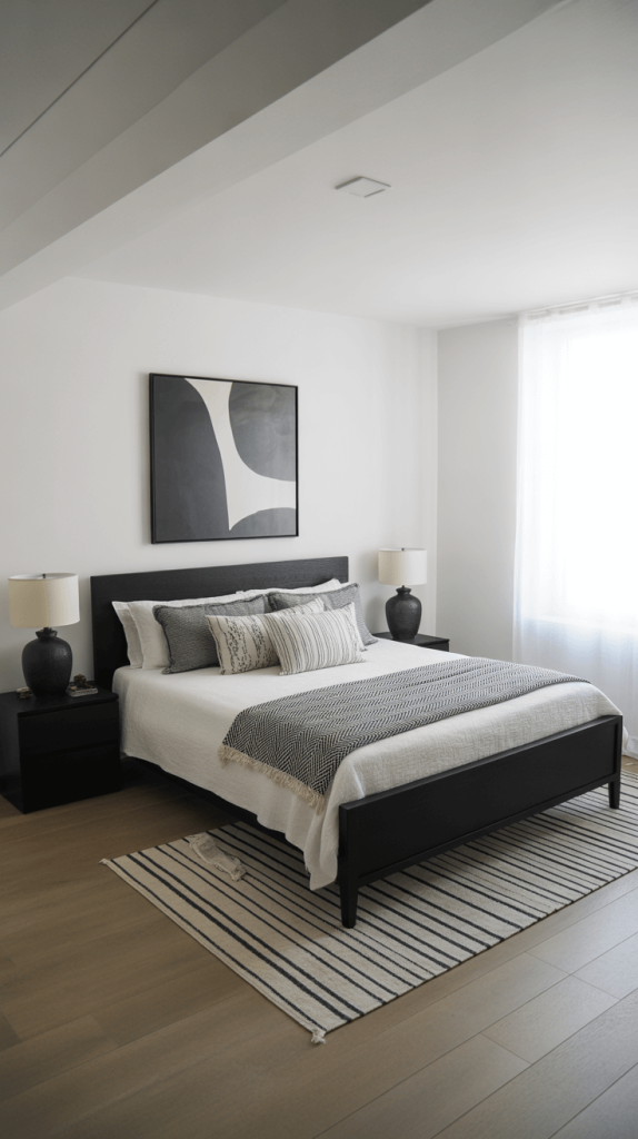 Start with a low-profile platform bed in black or dark wood. Keep your bedding simple – think crisp white sheets with maybe one black throw pillow for contrast. The magic happens when you strip everything down to essentials and let the black elements breathe.