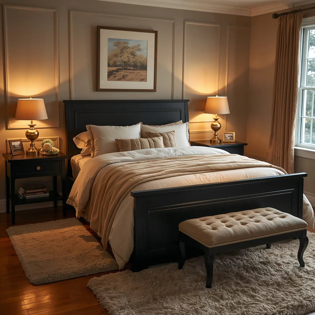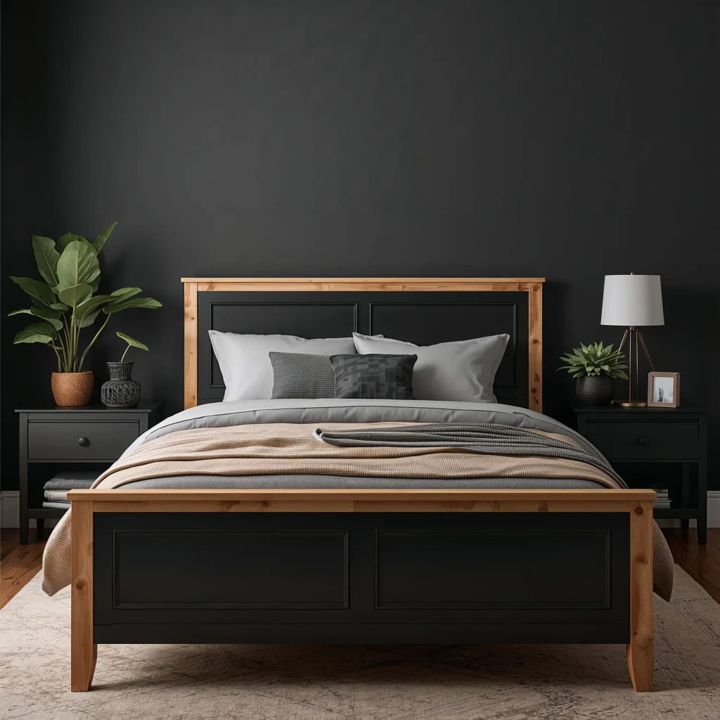 - Black Bed, Wood Nightstands: A simple black metal or upholstered bed frame paired with solid oak or walnut nightstands is a classic combo.