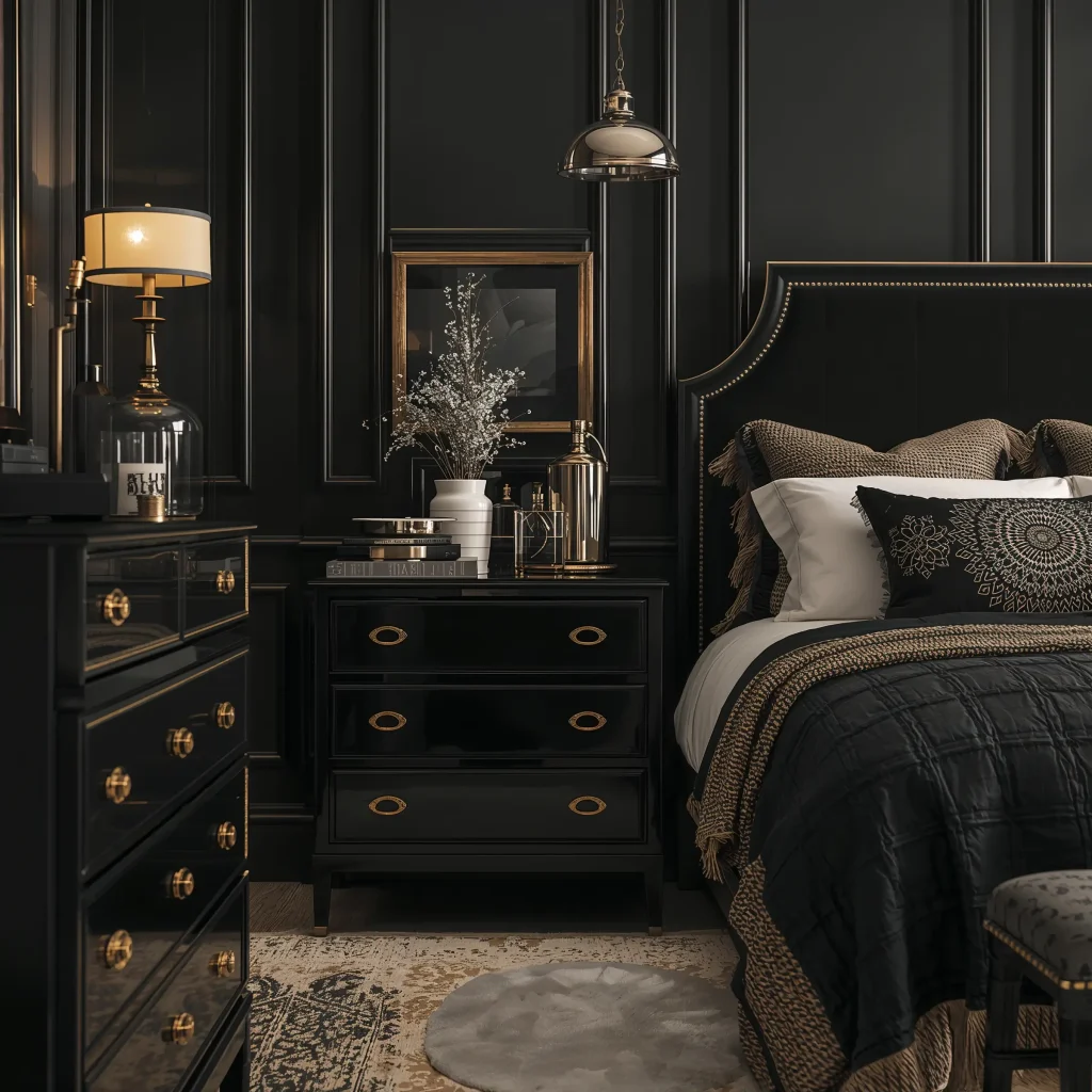 The magic is in the details. You take a simple piece of black furniture—a nightstand, a dresser, a wardrobe—and you add gleaming gold hardware.