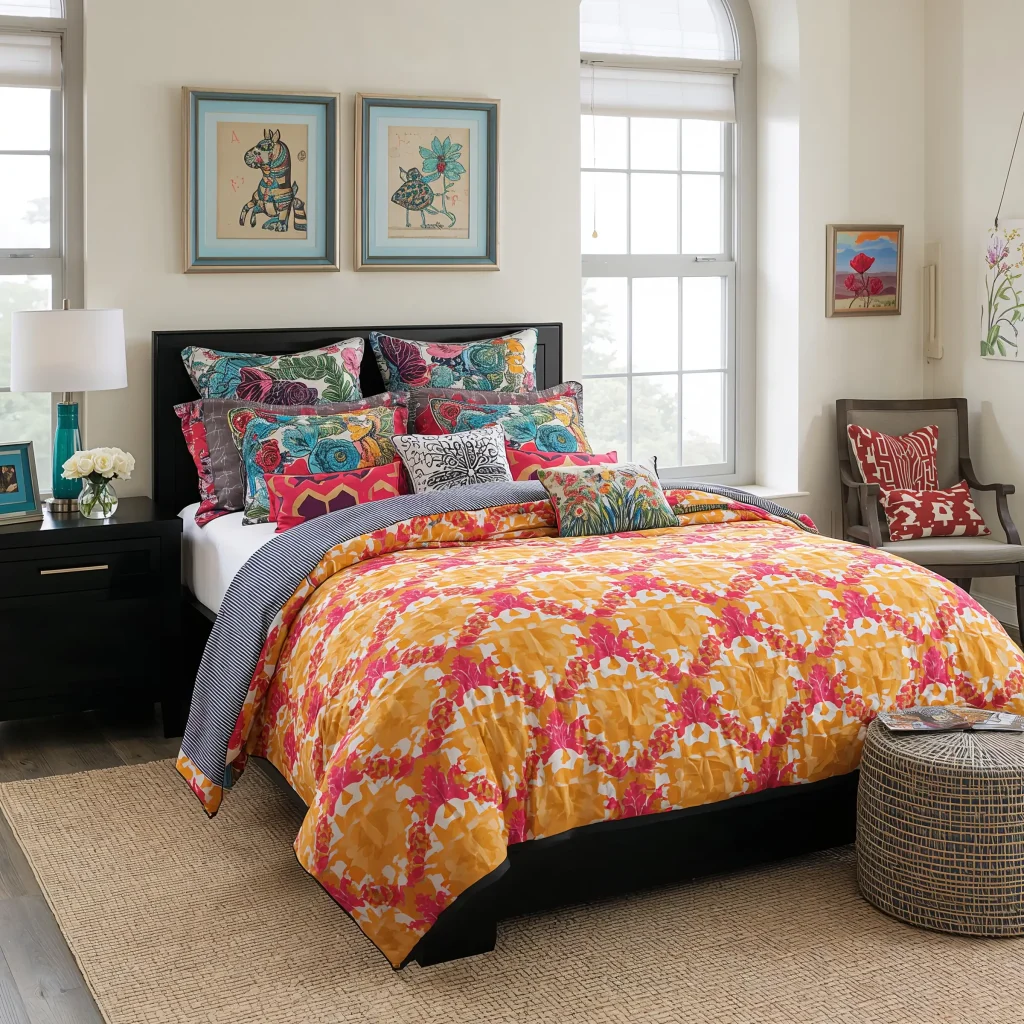 8. A Pop of Fun: Black Furniture with Colorful Bedding