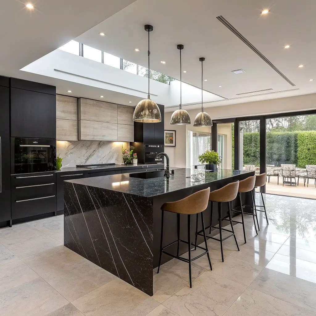 Contemporary island design embraces bold choices. Think waterfall edges, built-in wine fridges, and creative lighting solutions. The black granite surface ties all these elements together while providing the durability you need for food prep, homework sessions, and impromptu dance parties (just me?).