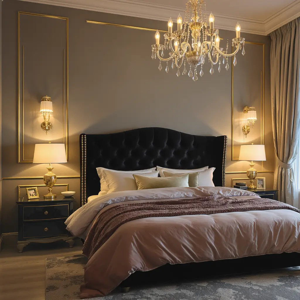 Want a room that screams “I have impeccable taste”? Pair a black headboard with gold accents. This combination is the epitome of chic luxury.