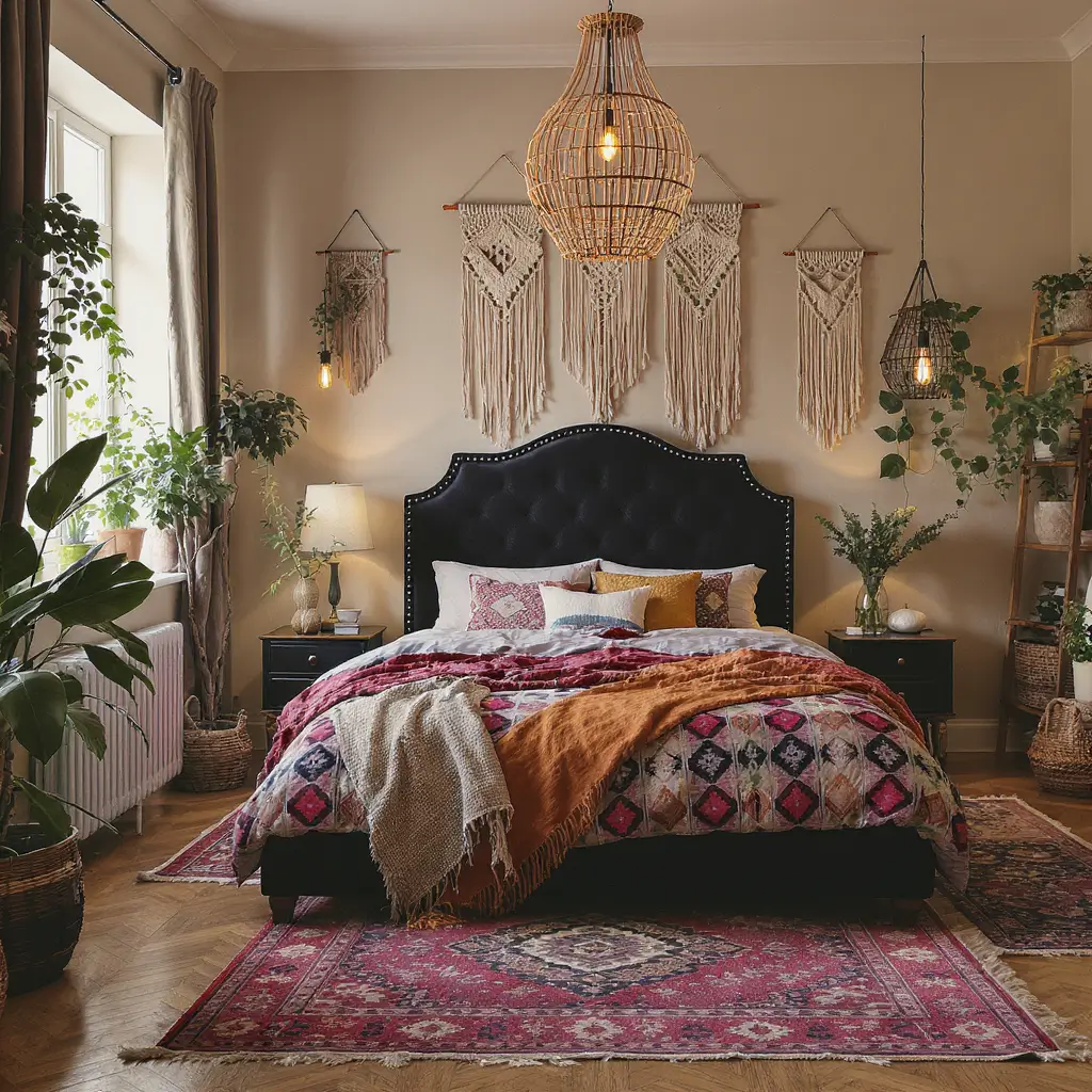 The success of this look lies in contrast. The black headboard provides a solid, modern counterpoint to the soft, organic, and often vintage elements of boho decor.