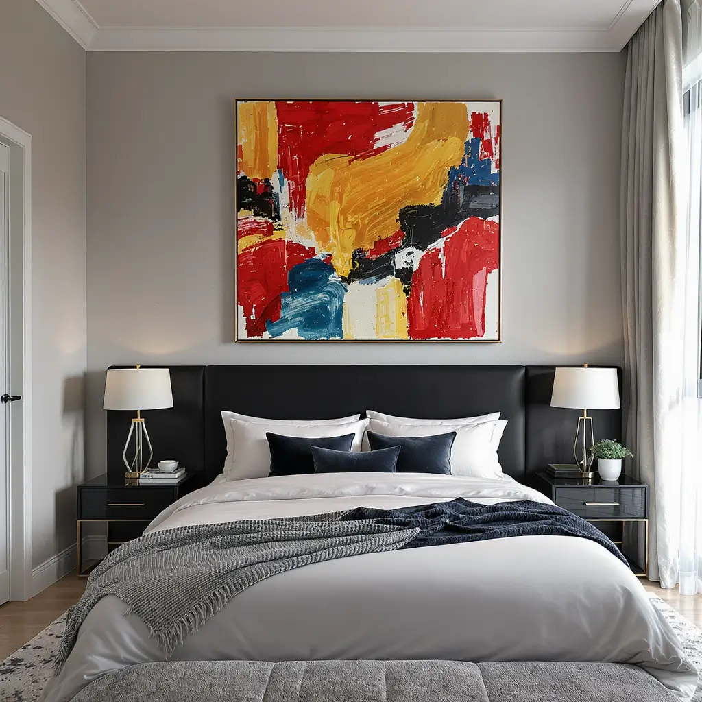 - Pull Colors from the Art: To create a cohesive look, pull one or two accent colors from your artwork and repeat them in your bedding or decor. A couple of throw pillows or a vase in a coordinating color is all it takes.