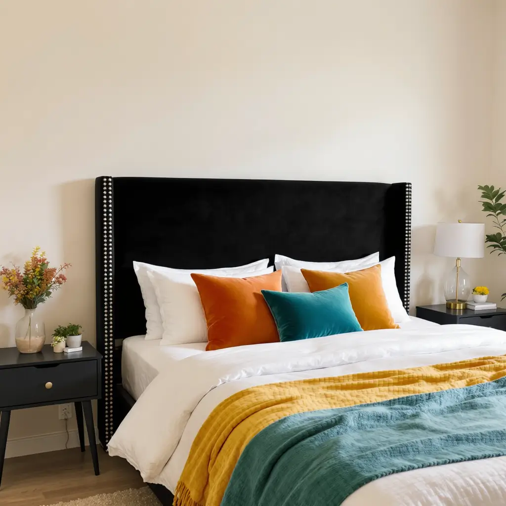 - Start with a Neutral Base: Your black headboard is the star. Pair it with crisp white or light grey walls and bedding. This creates a clean canvas for your color pops.