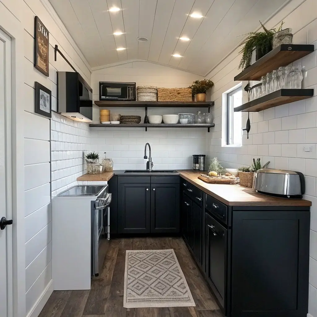 Another game-changer? Open shelving mixed with black cabinets. Replace some upper cabinets with floating shelves to create breathing room. Display your pretty dishes and glassware – they’ll pop against those dark lower cabinets like art pieces.