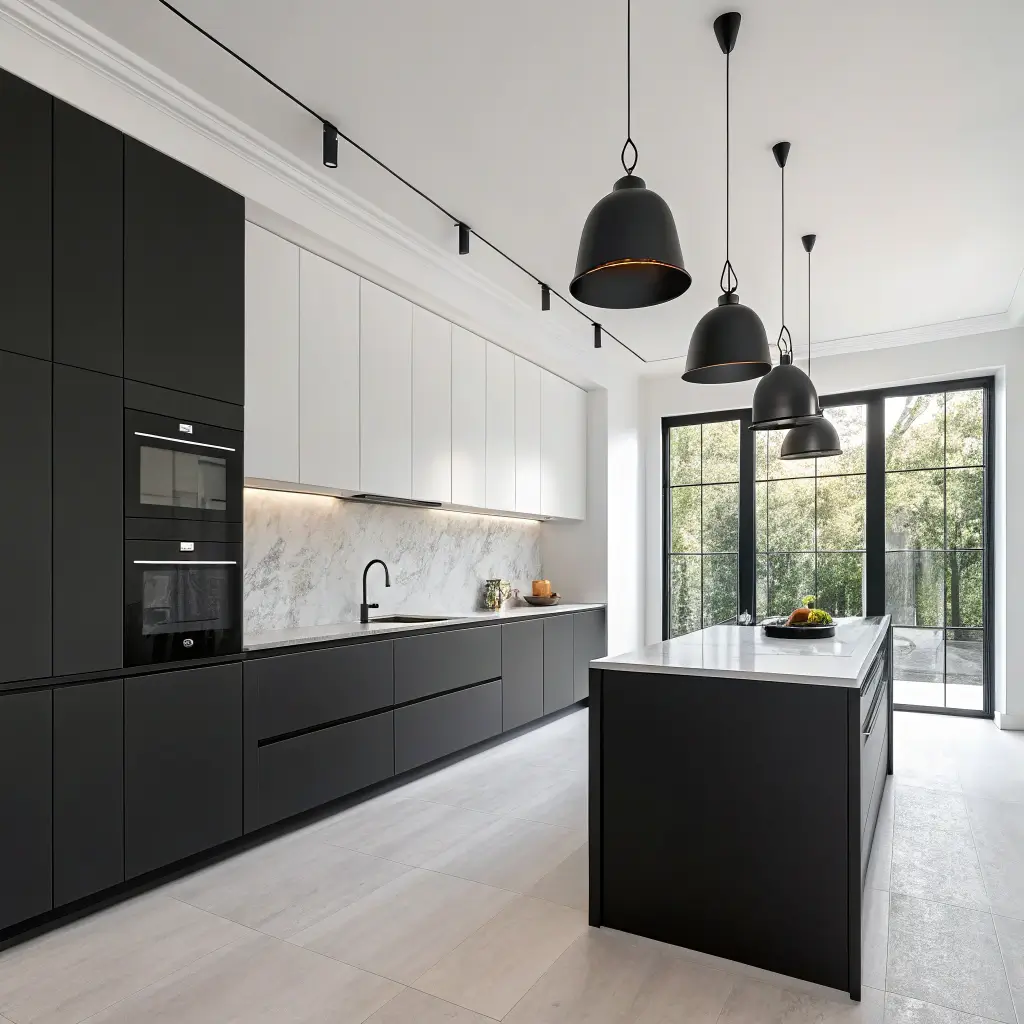 Luxury Black Kitchen Cabinets with Pendant Lighting