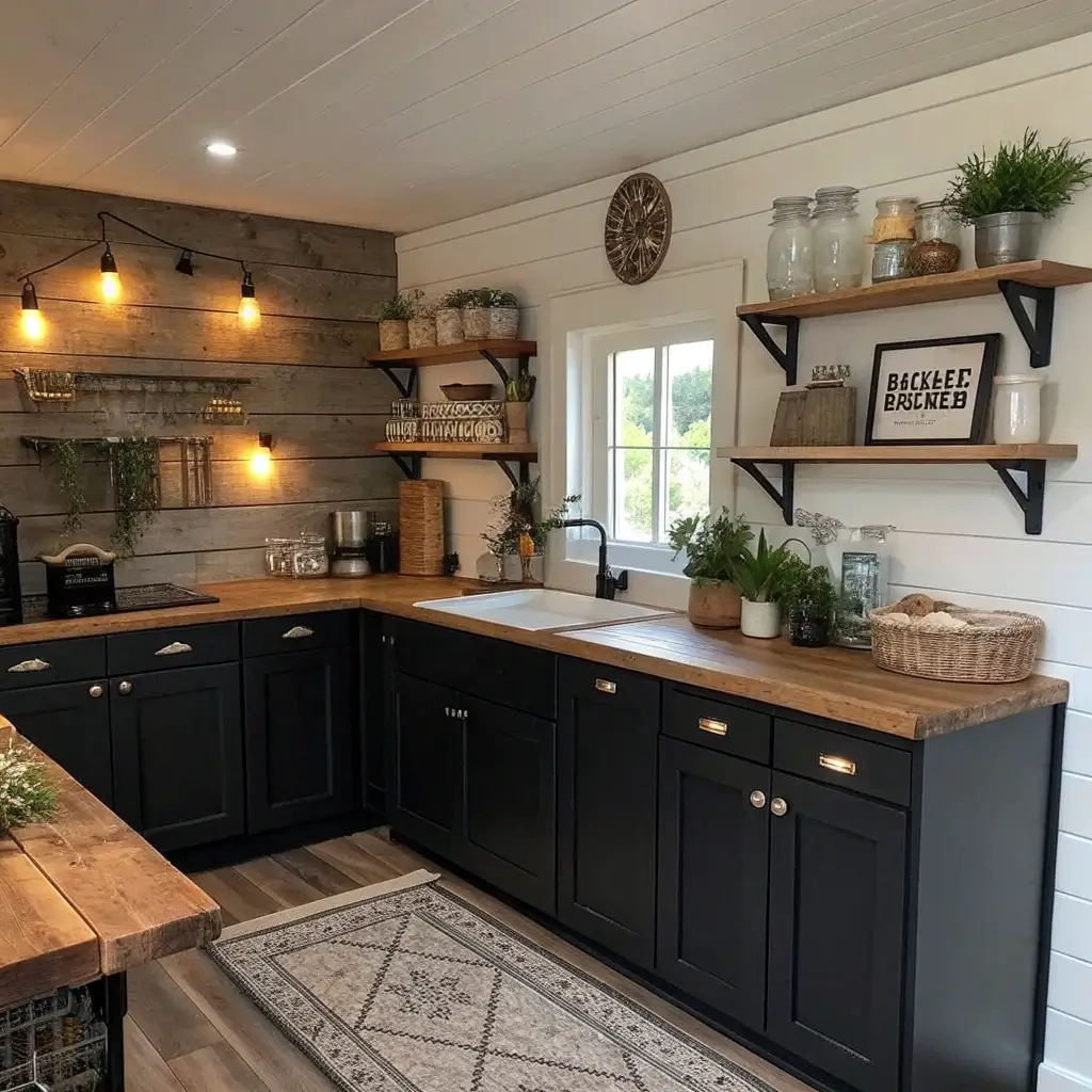 Rustic Black Kitchen Cabinets with Wood Touches