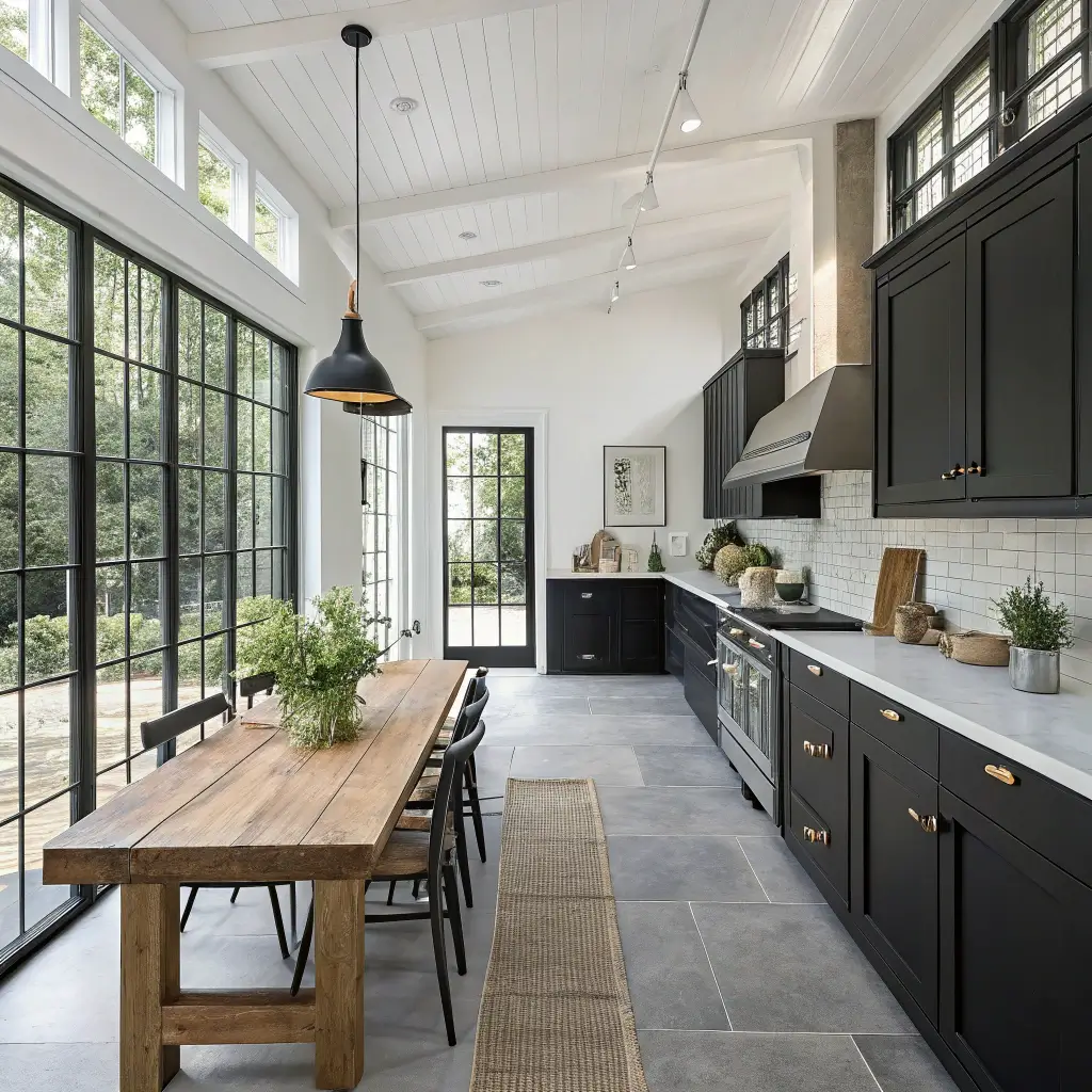 My cousin did this in her farmhouse kitchen, and the contrast is stunning. She kept the original wood beams exposed on the ceiling, added black cabinets, and threw in a massive wooden dining table. The space feels both sophisticated and welcoming – like a high-end restaurant you actually want to hang out in.