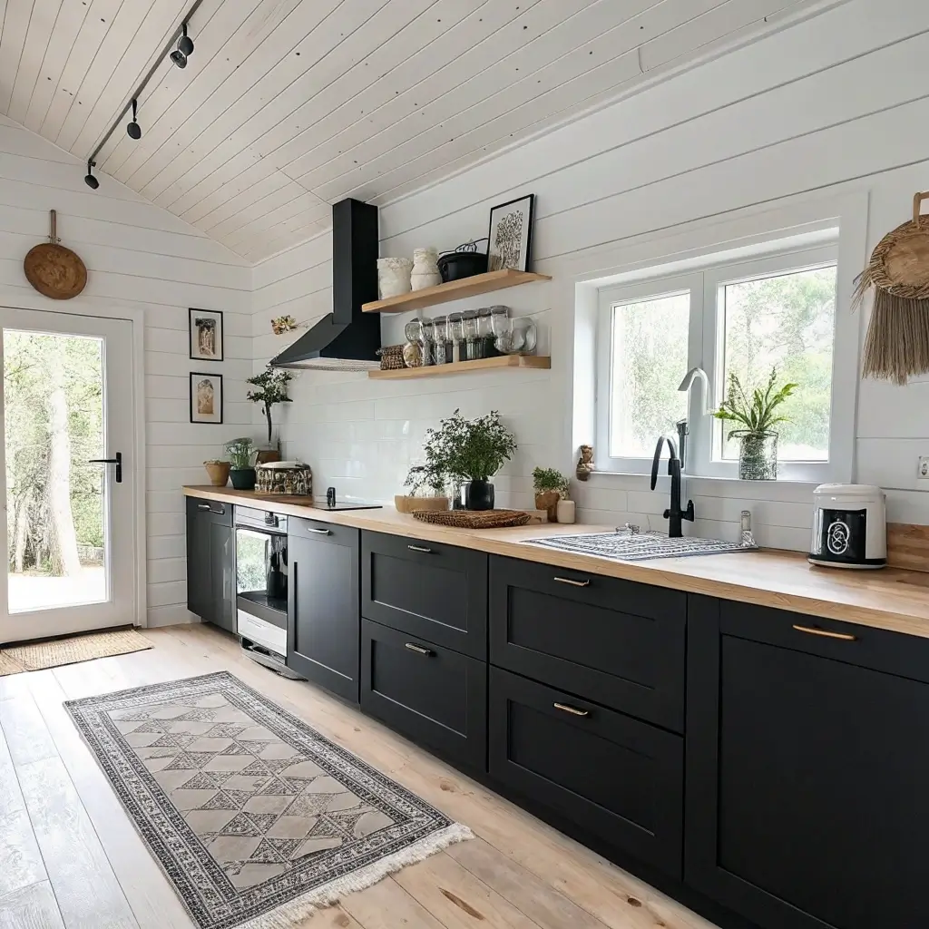 The key is balancing those black cabinets with lots of natural light, warm wood accents, and simple, functional design. No clutter, no fuss, just beautiful simplicity that makes you want to bake bread and drink coffee all day.