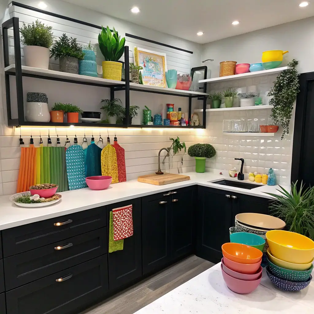 Here’s where you can have some real fun. Black cabinets create the perfect backdrop for colorful accessories to shine. Think of them as your gallery wall – neutral and sophisticated, letting your personality pieces take center stage.