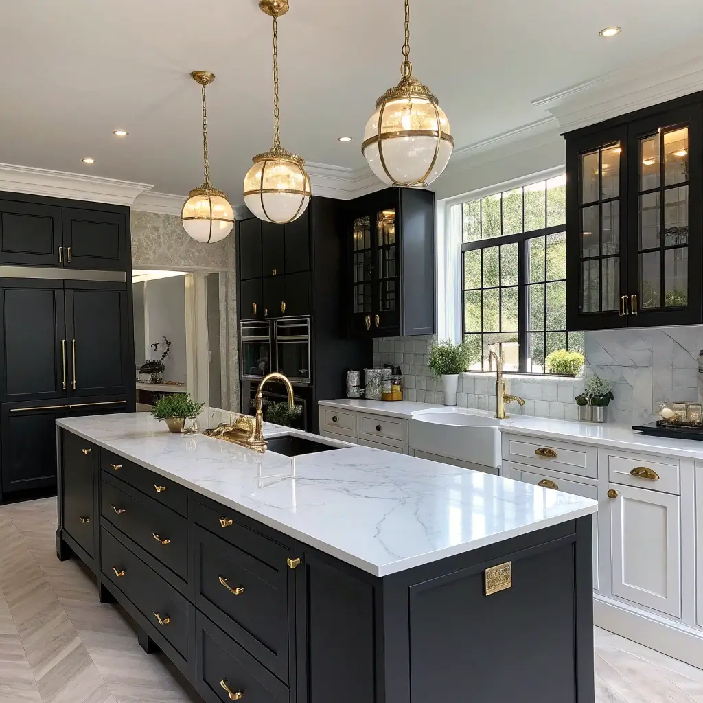 Nothing says luxury quite like statement pendant lights hovering over black cabinets. The contrast creates instant drama, and the right fixtures can completely transform the space from nice to knockout.