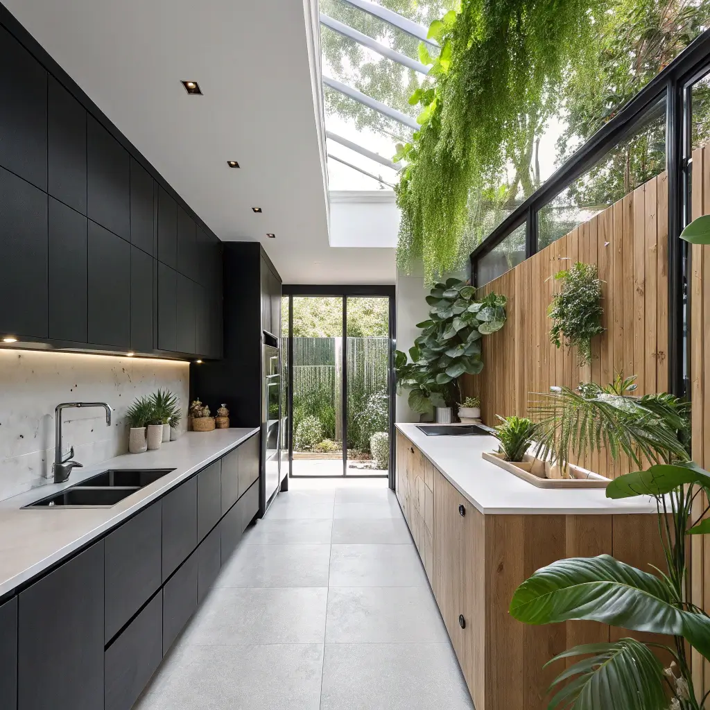 Now here’s a combination that shouldn’t work but absolutely does. Black cabinets paired with raw wood elements creates this moody, cabin-meets-city vibe that’s incredibly inviting. Think black shaker cabinets with a thick butcher block island, or matte black uppers with reclaimed wood open shelving.
