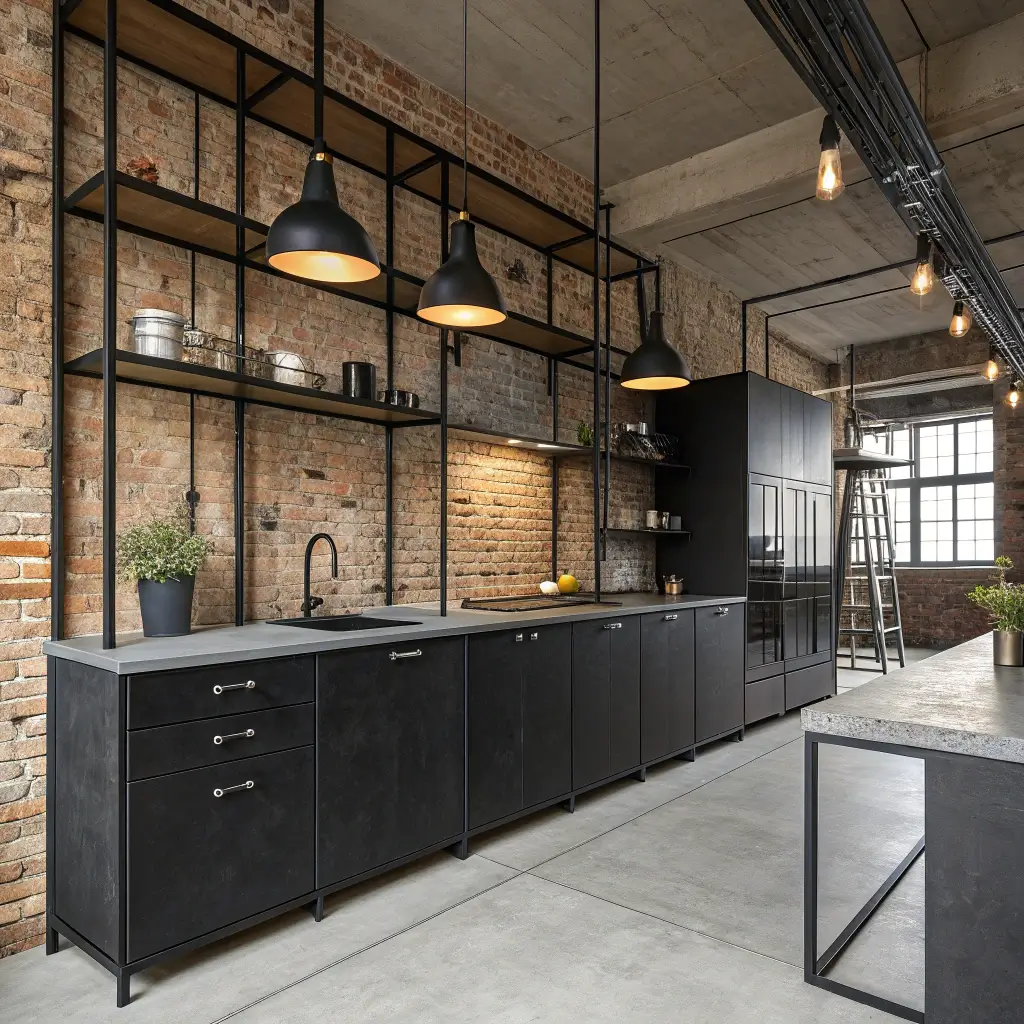 Industrial Black Kitchen with Exposed Shelving